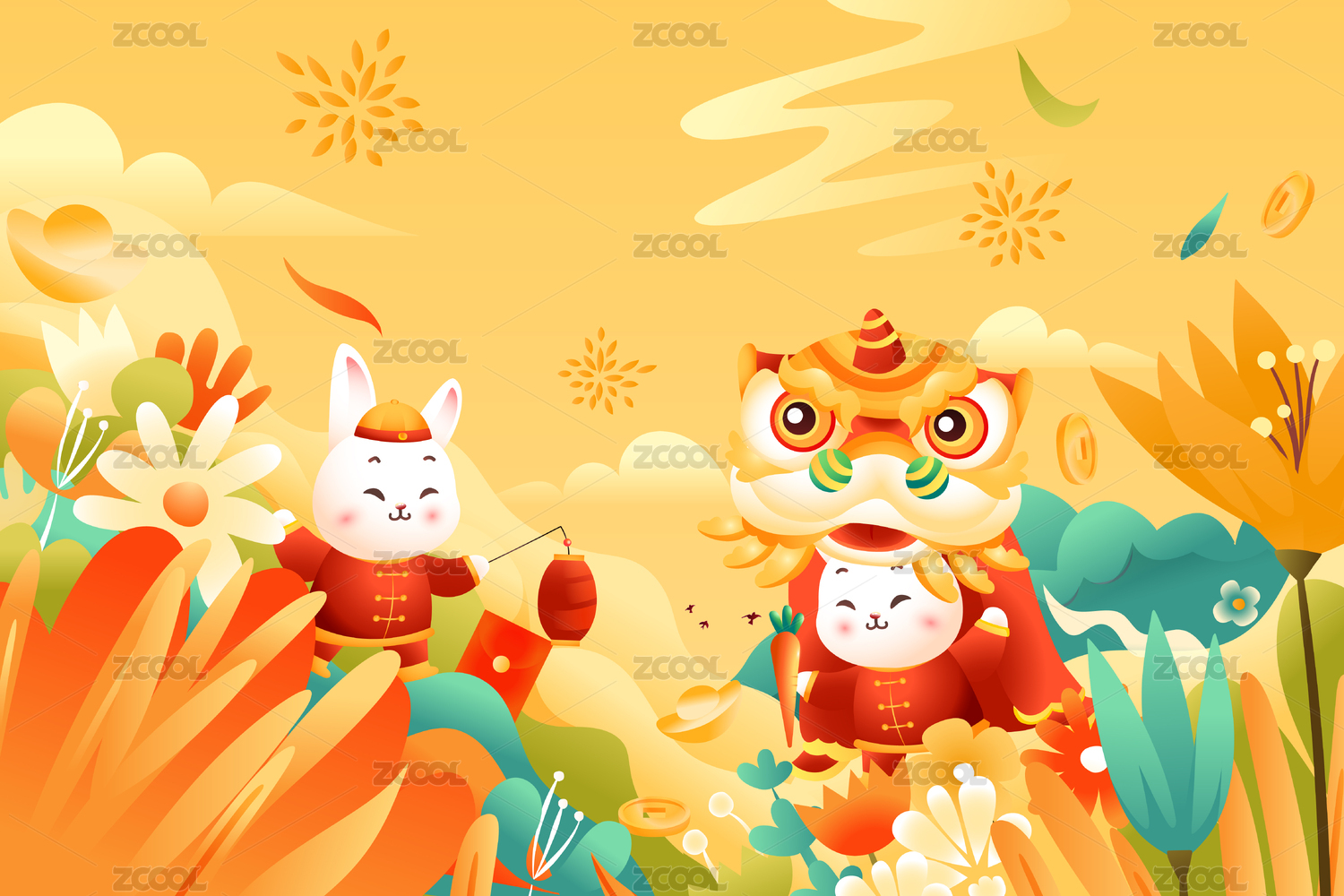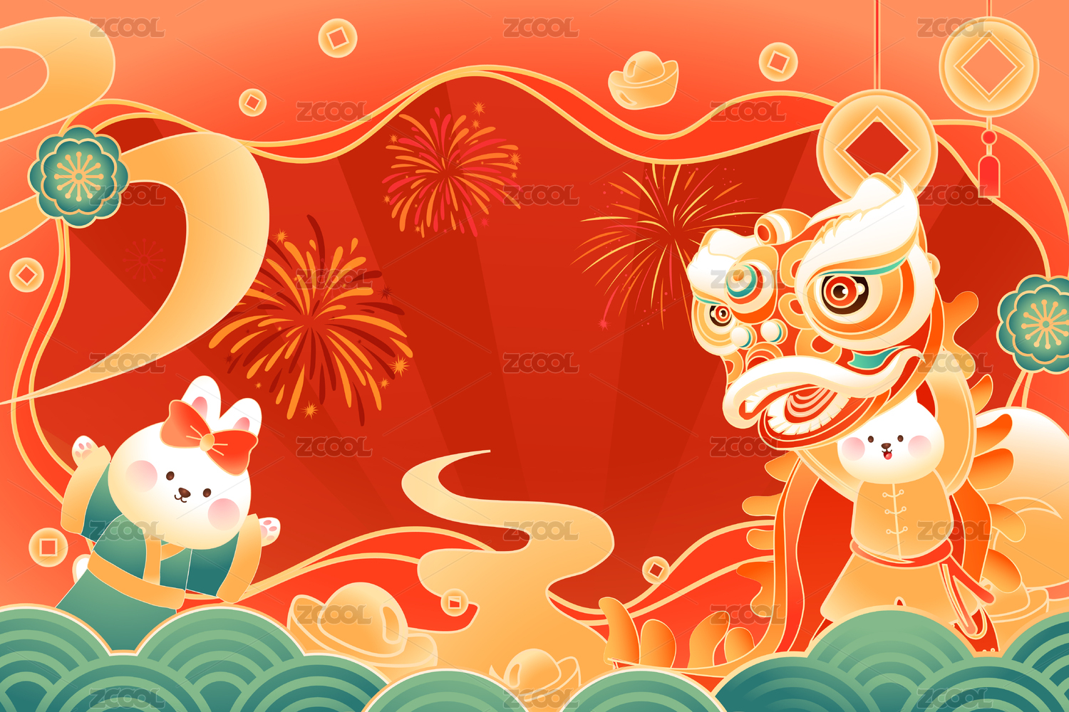 卡通2020鼠年新年舞狮中国风背景矢量插画