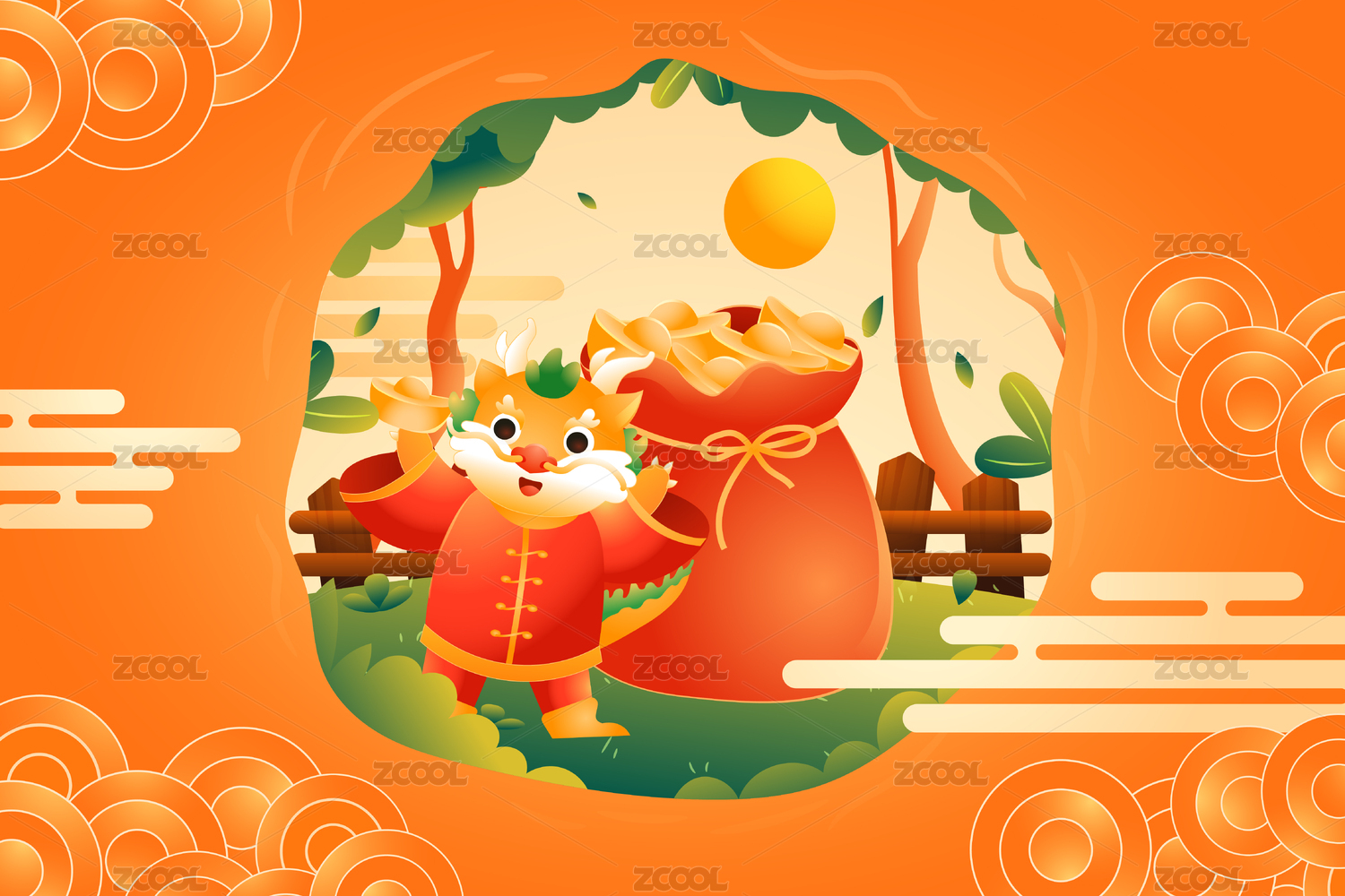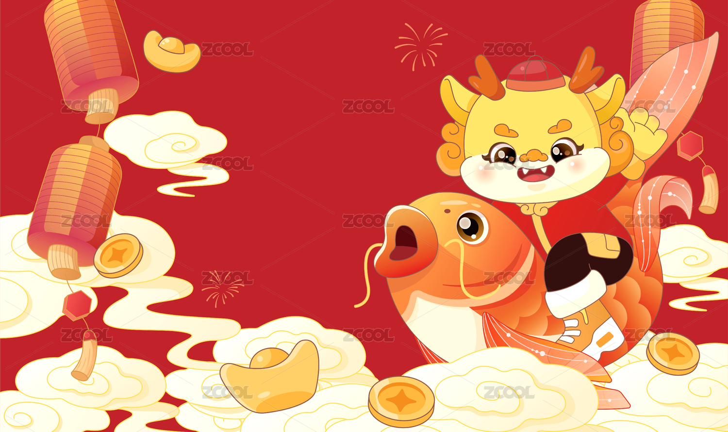 国潮风新年龙年一只龙坐在锦鲤上面手拿红包