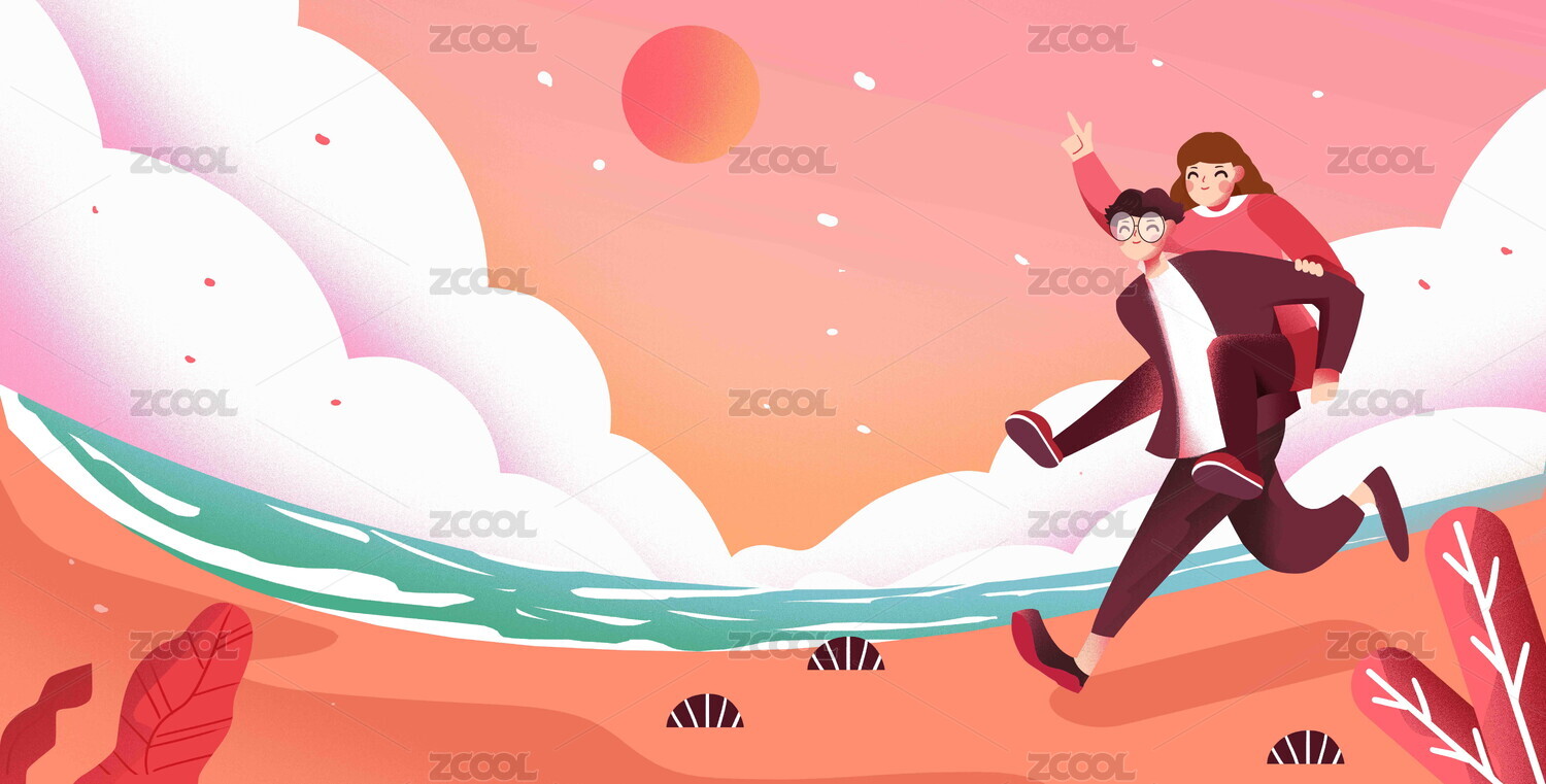 卡通粉色情侣恋人男孩背着女孩奔跑插画