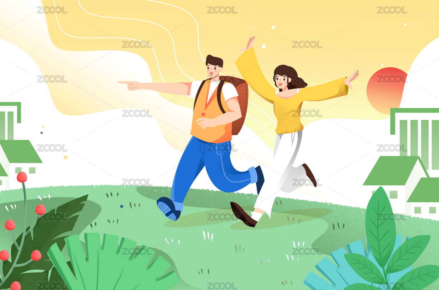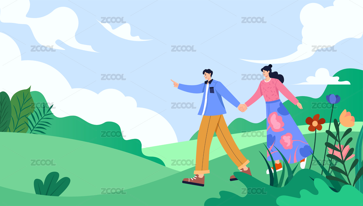 绿色田野上的情侣插画