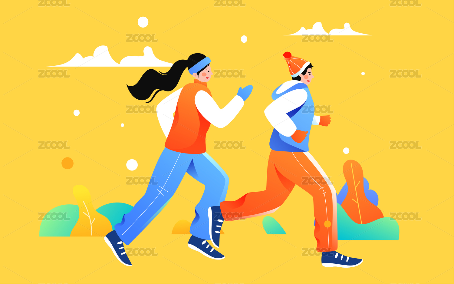 跑步人物冬天运动插画情侣户外锻炼身体海报