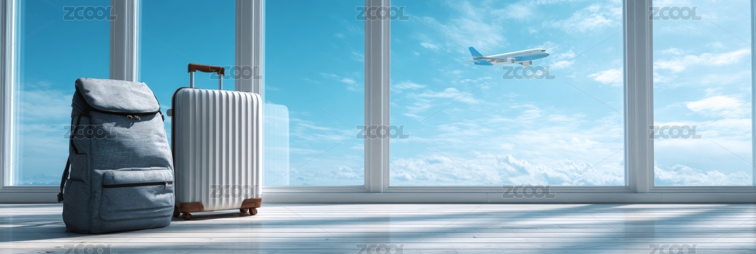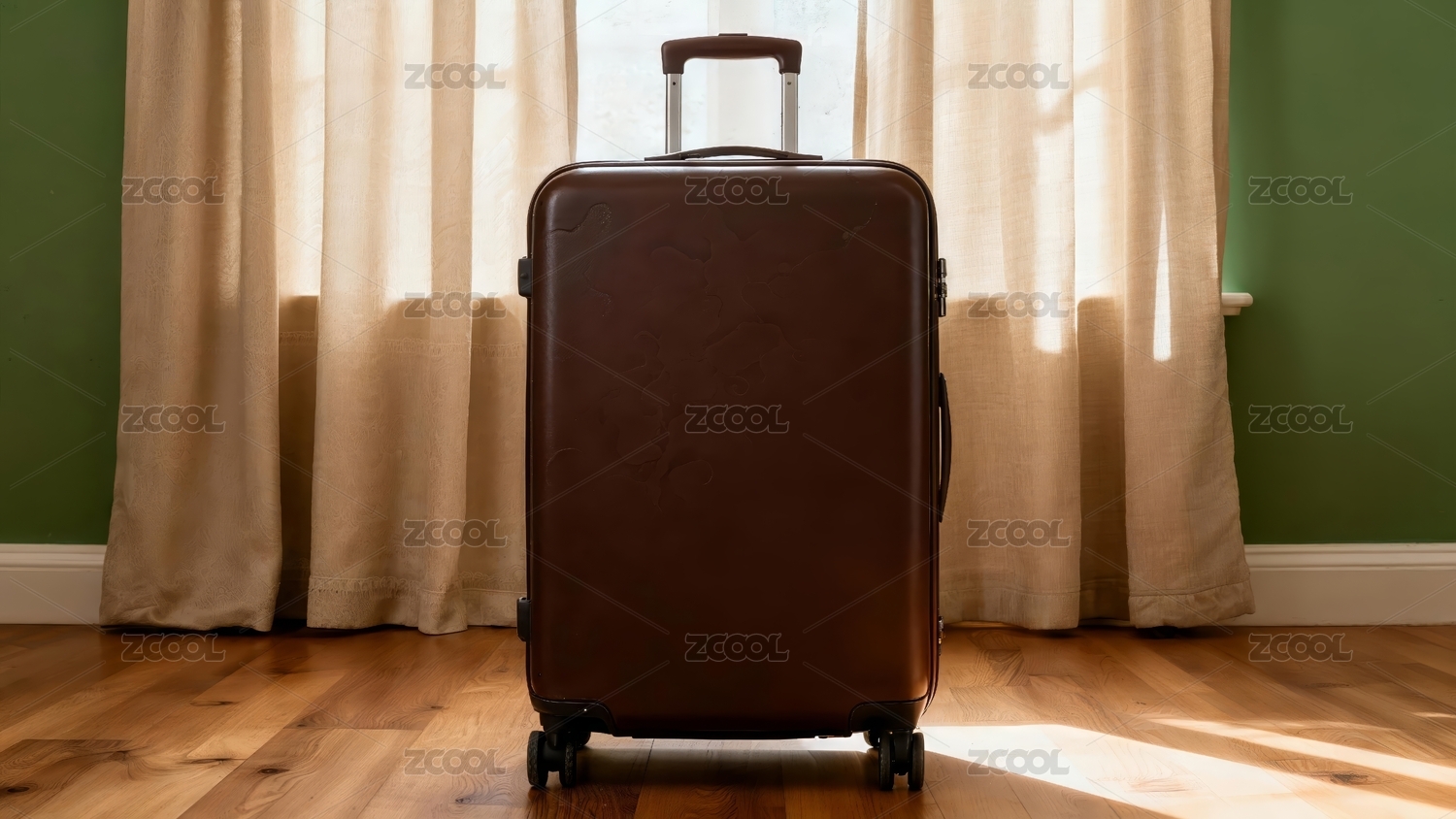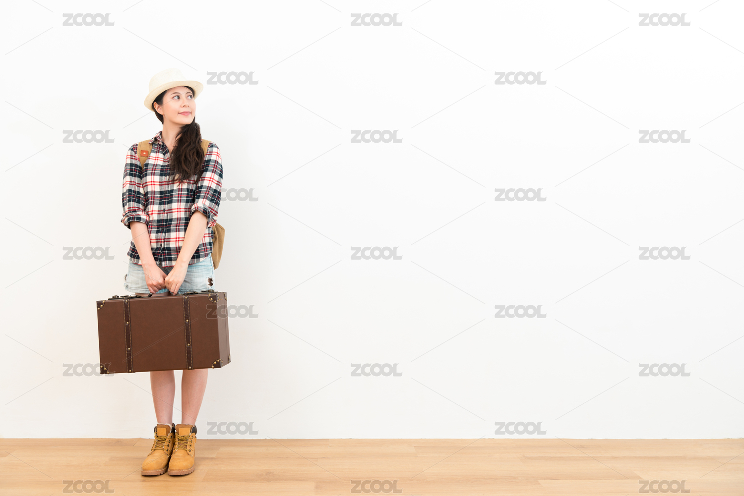年轻优雅的旅行者女子站在木地板看着白色的墙壁思考旅游规划和携带手提箱。