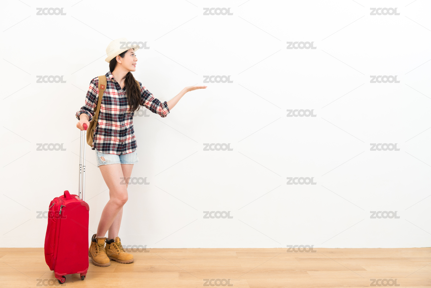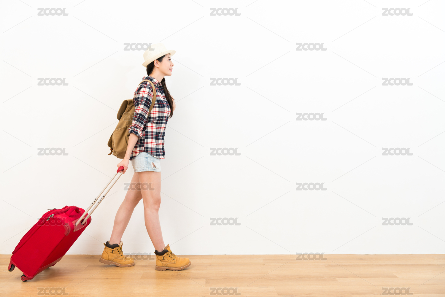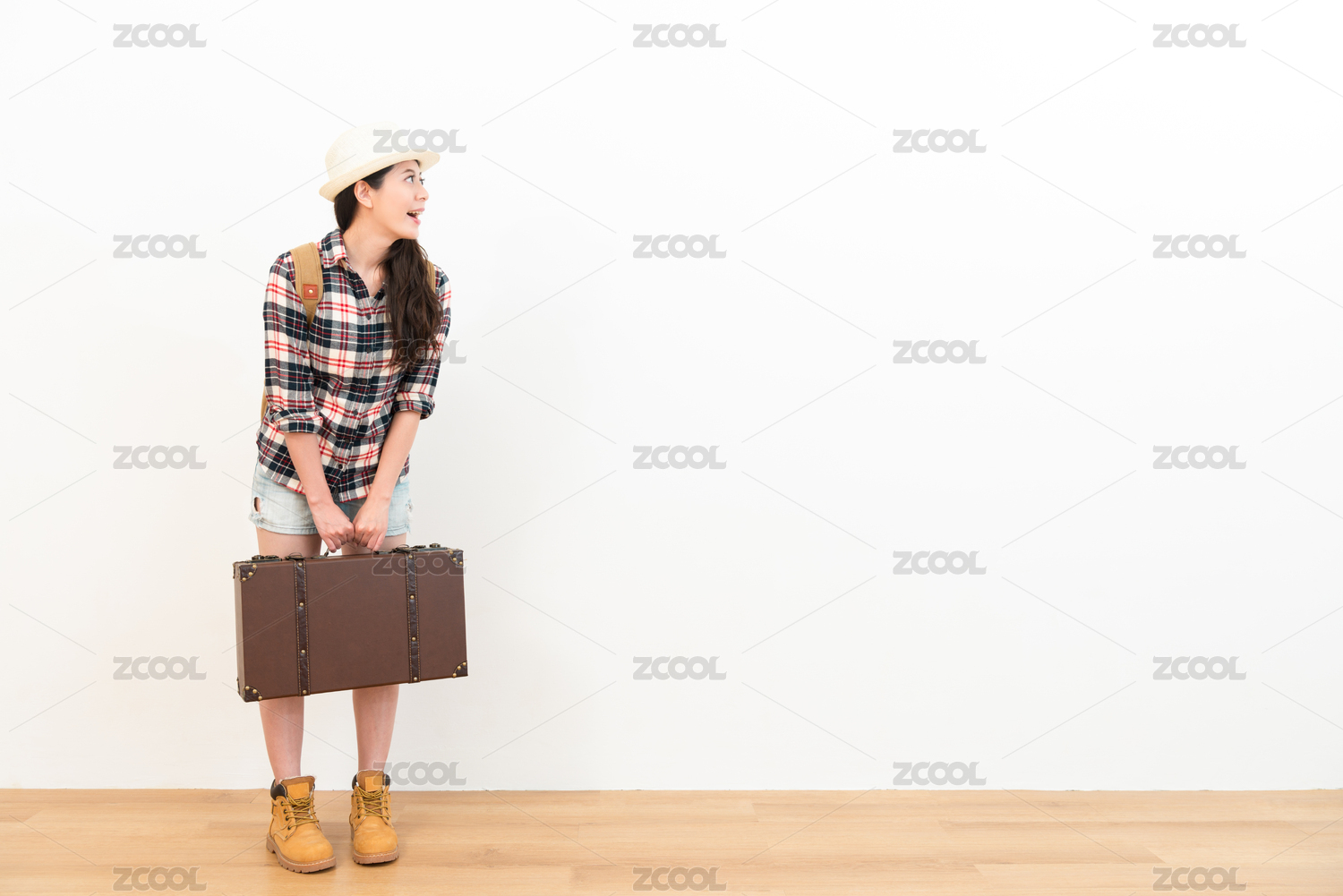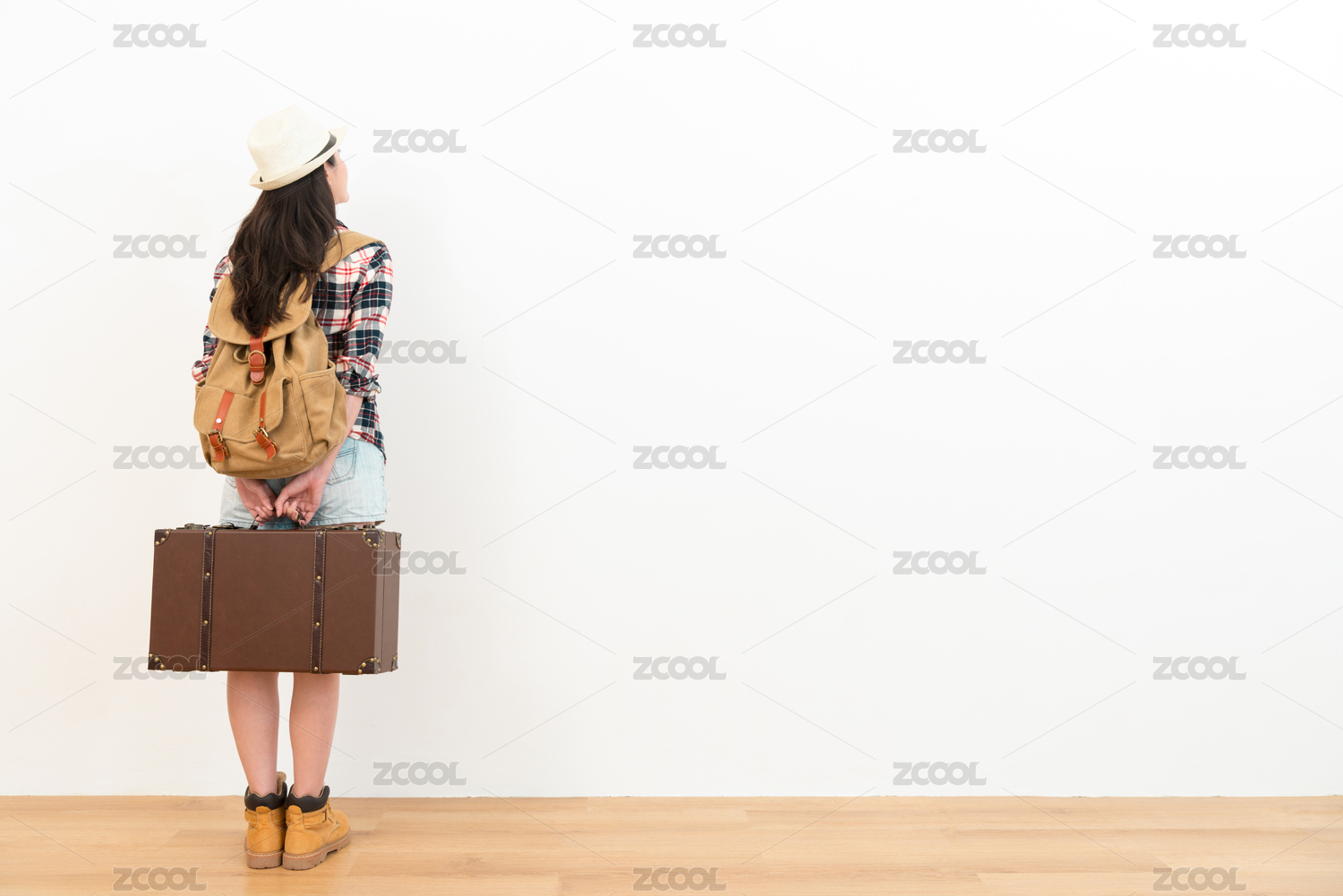喜糖背包客小姐计划要去旅行和携带手提箱的个人走在白色的墙壁背景的木地板。