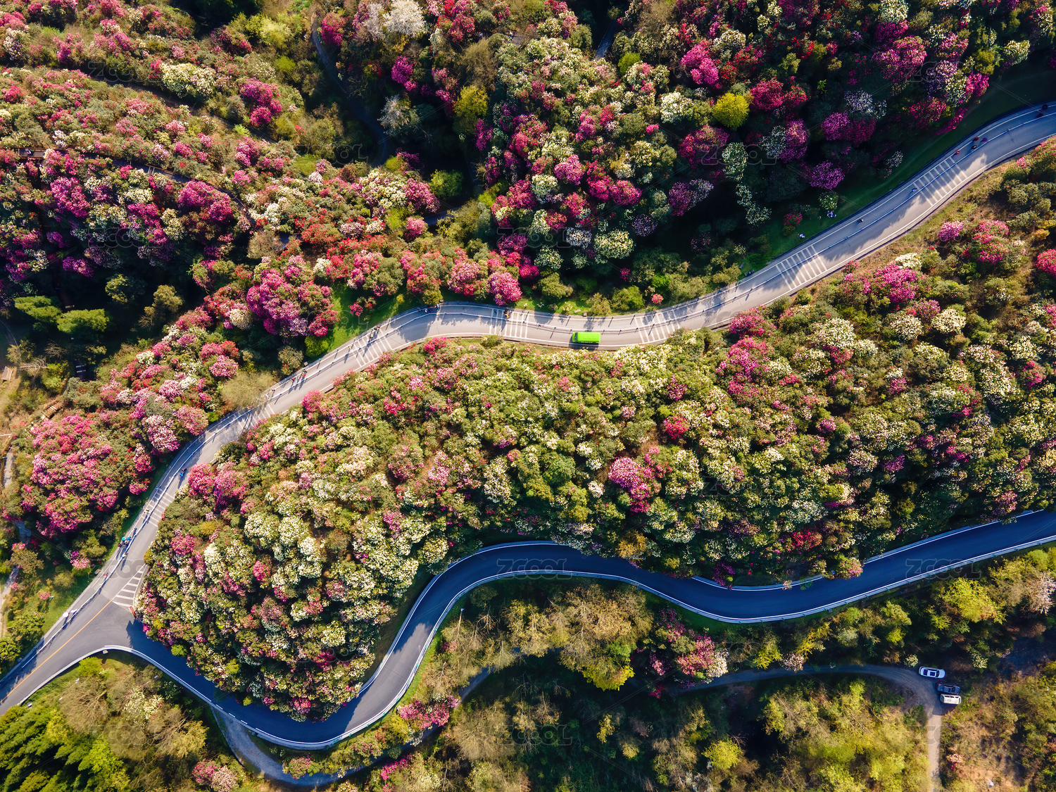 航拍春天中国贵州毕节杜鹃盛开的百里杜鹃风景区
