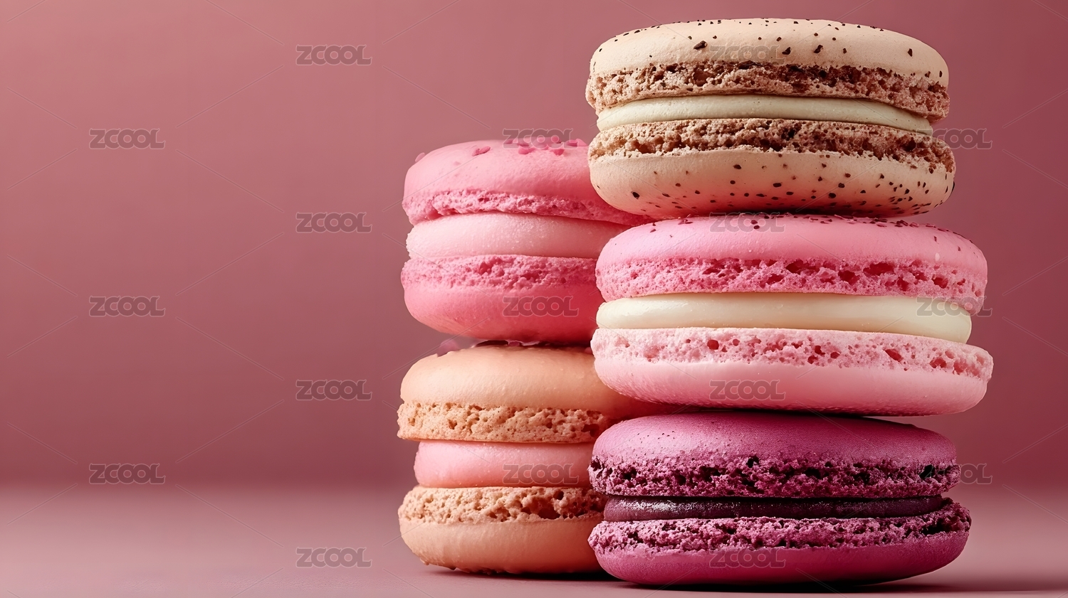 几个粉红色马卡龙堆叠在粉红色背景上图片