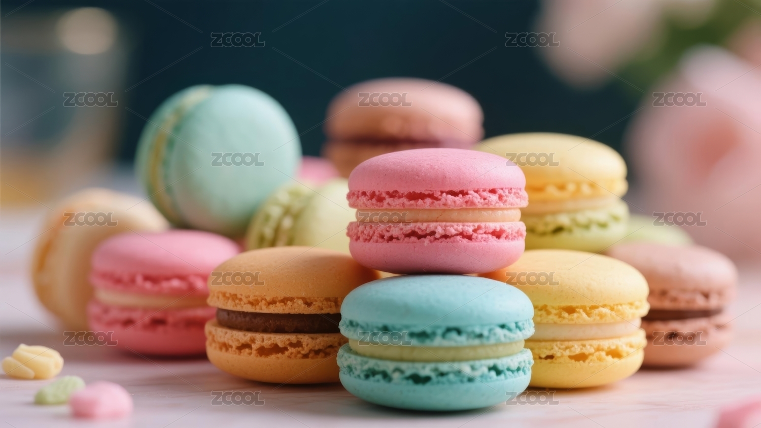 色彩缤纷的马卡龙排列在一起,展现出甜美诱