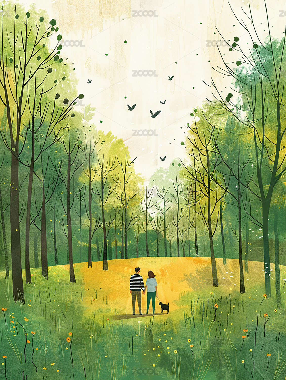 穿白裙子的女孩在树林中遇见穿白衬衣的男孩