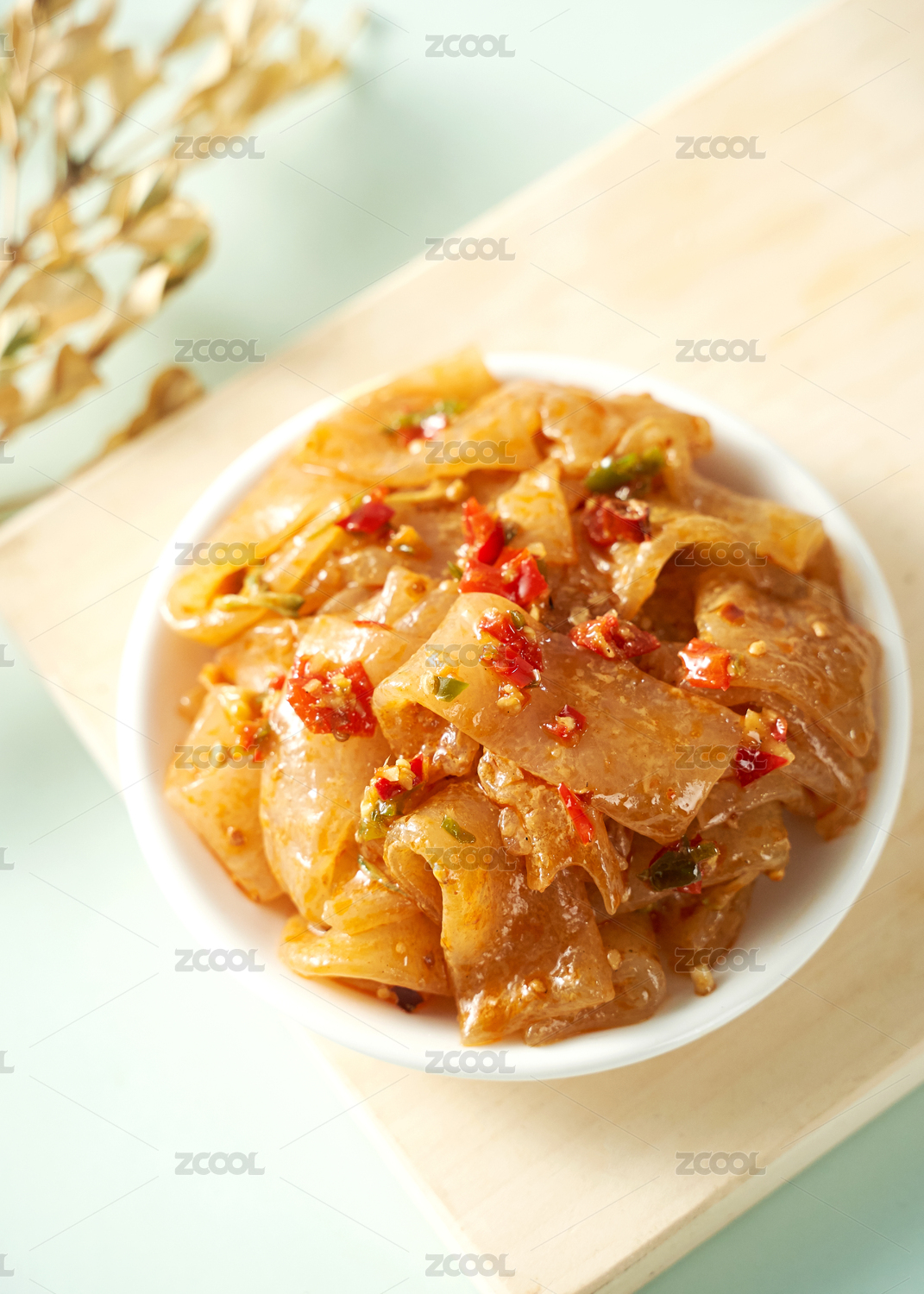 木纹桌面上陶瓷盘里摆放的薄片豆干