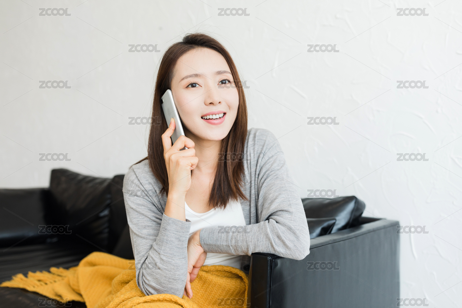 一个年轻女性坐在沙发上微笑打电话看向前方