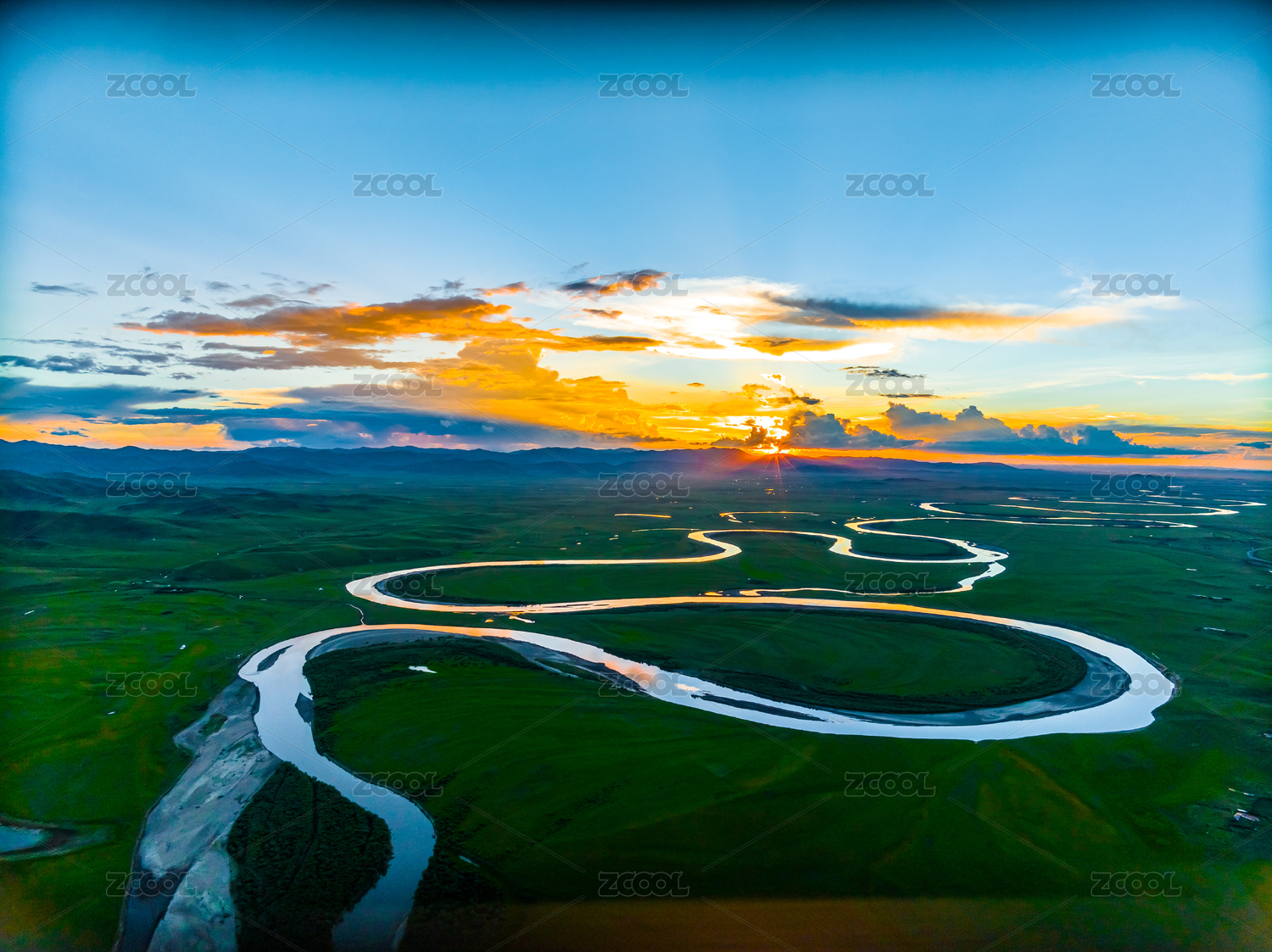 中国,河流,阳光,日出,日落,蓝天白云,自然风光,航拍,俯瞰,草甸