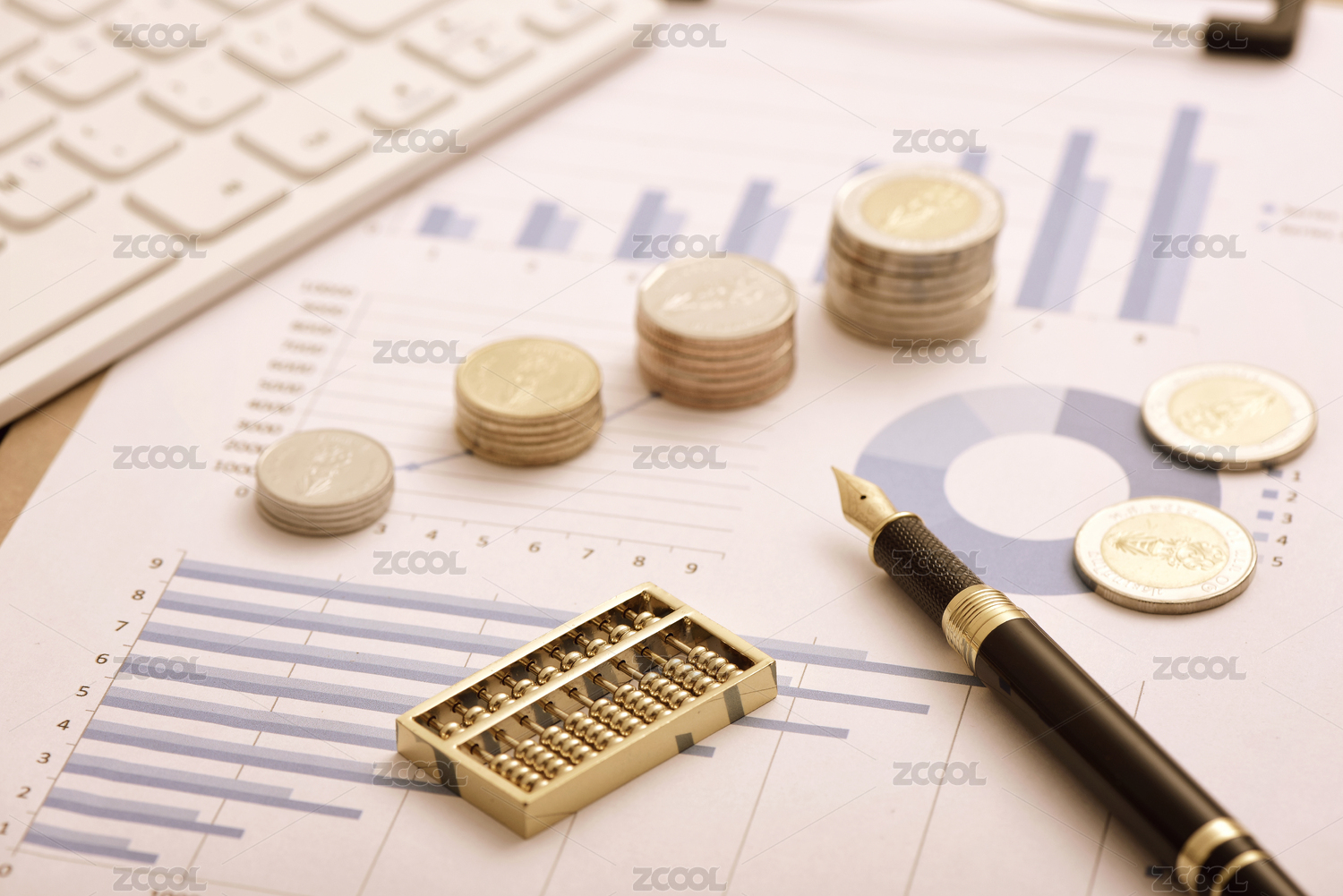 金融经济数据增长概念——放在财务数据报表分析场景上的硬币、算盘和电脑
