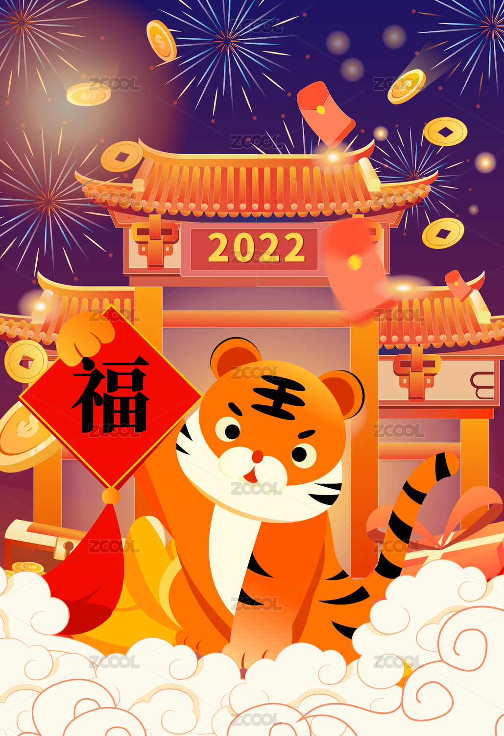 HEVCSF2022,虎年,老虎,猛虎,卡通,2022年,新年,家门口,敲锣,打鼓