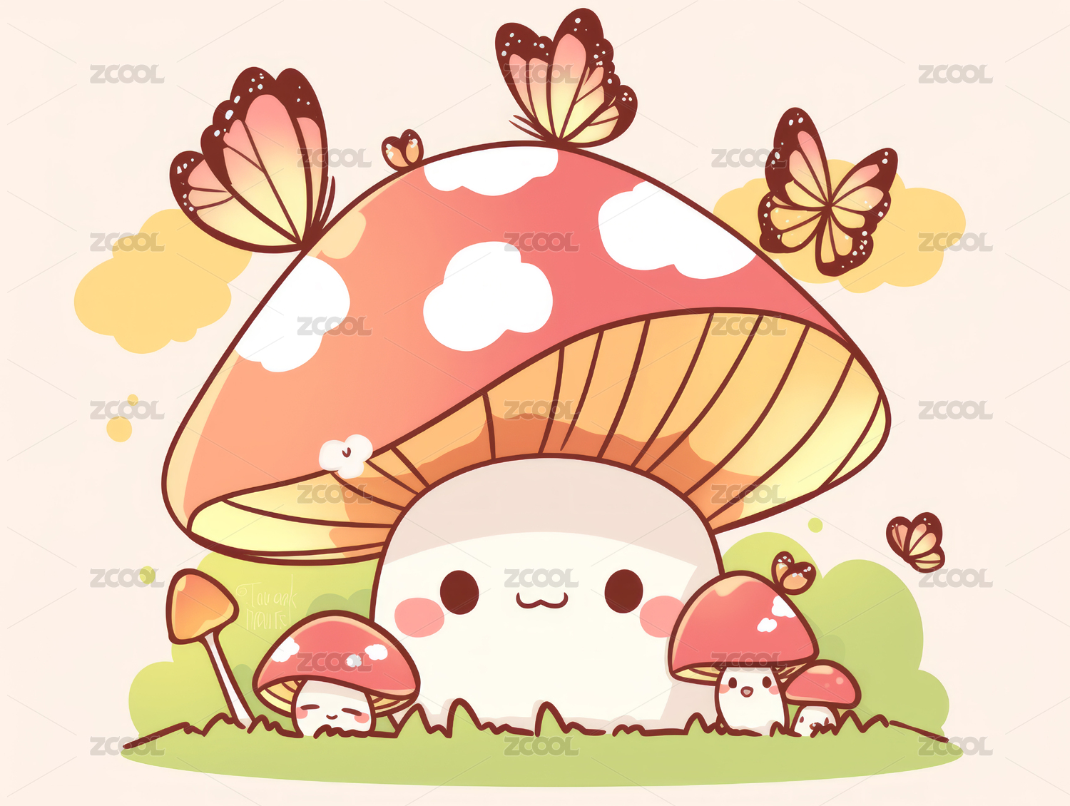 卡通可爱蘑菇拟人蝴蝶清新治愈插画