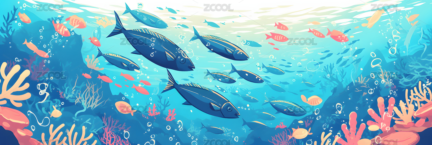 q版,彩色,高清,动物,儿童,插画,海底,鱼群,珊瑚,海藻