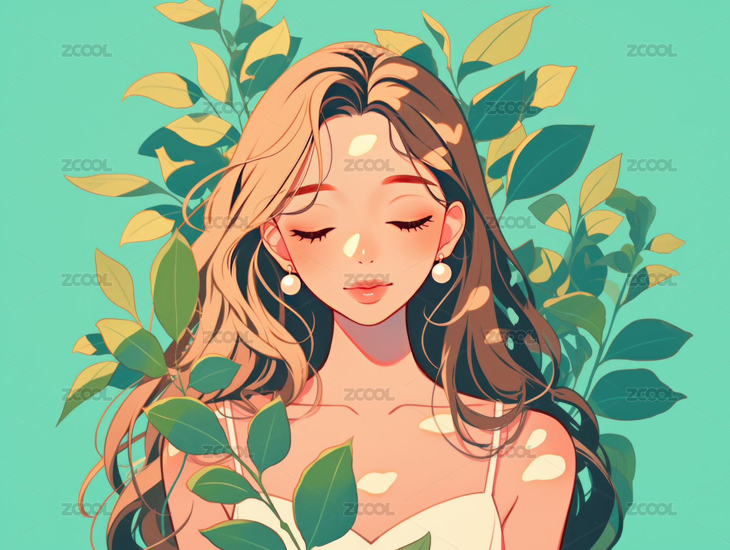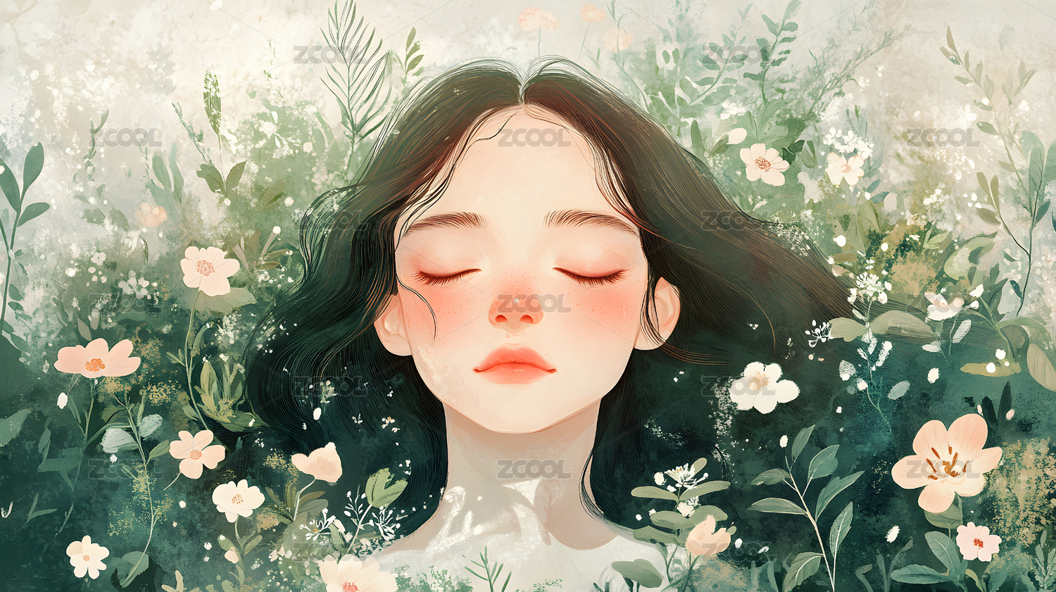 飘逸长发的美女与植物清新唯美插画