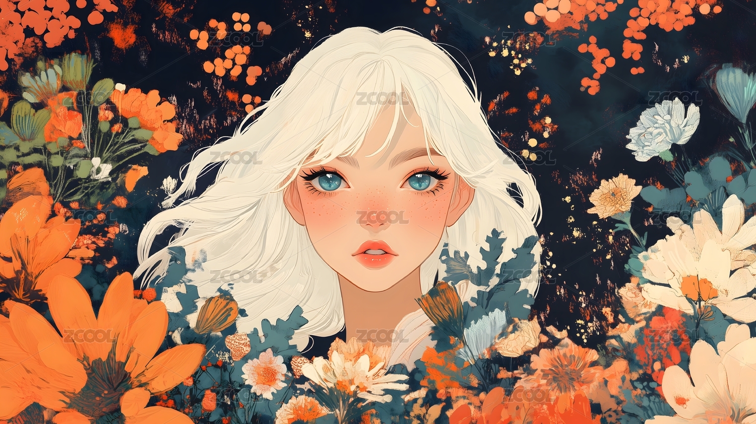 被鲜花围绕的白发女孩插画