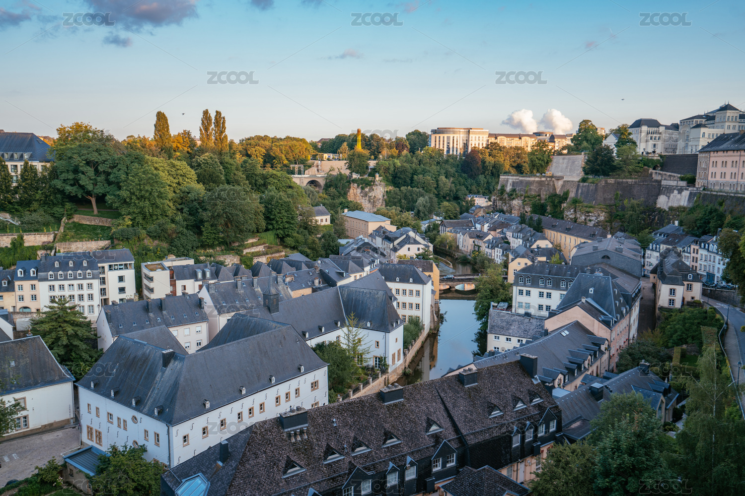 欧洲卢森堡城市风光,远方是阿道夫桥与历史建筑
