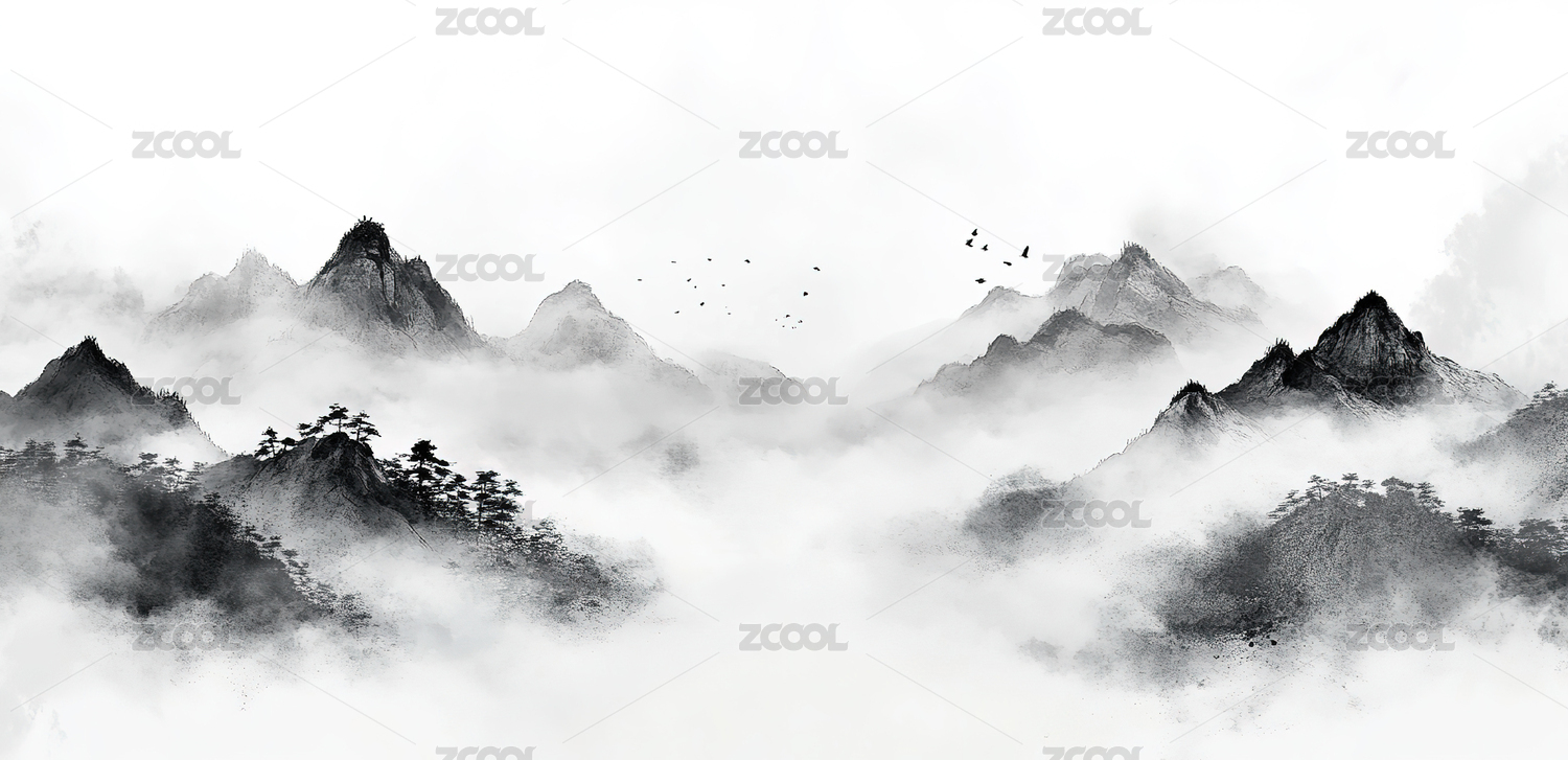 水墨山水画云雾缭绕飞鸟