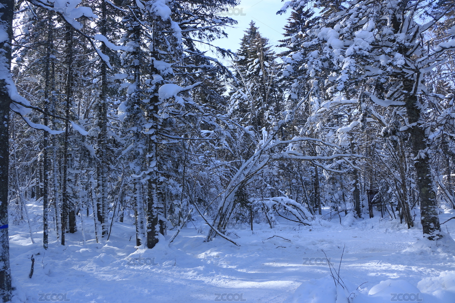 峨眉山树林雪景,阳光洒在错落有致的树干上