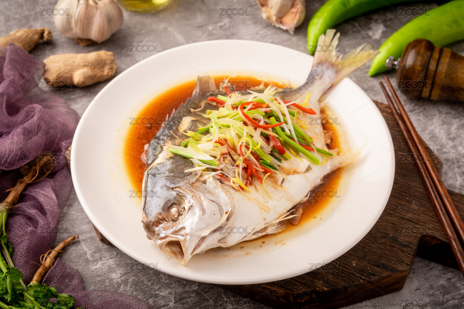 复古中式木纹桌子上的一盘清蒸金鲳鱼