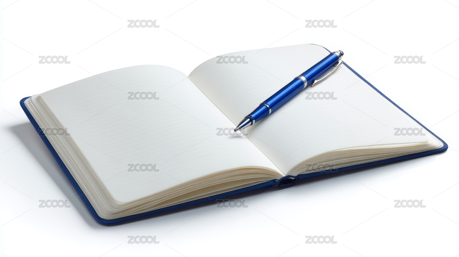打开笔记本带有空白白页和蓝色钢笔在上方