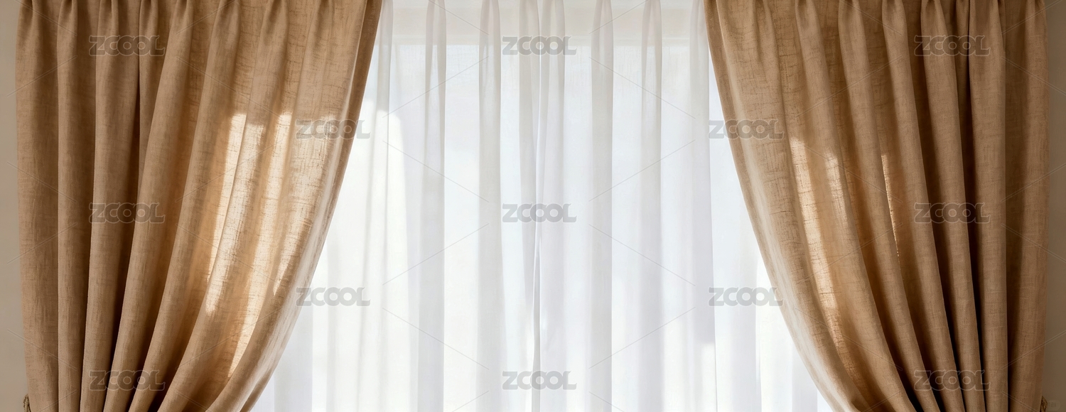 明亮的空房间与穿过窗帘的阳光光,三维渲染