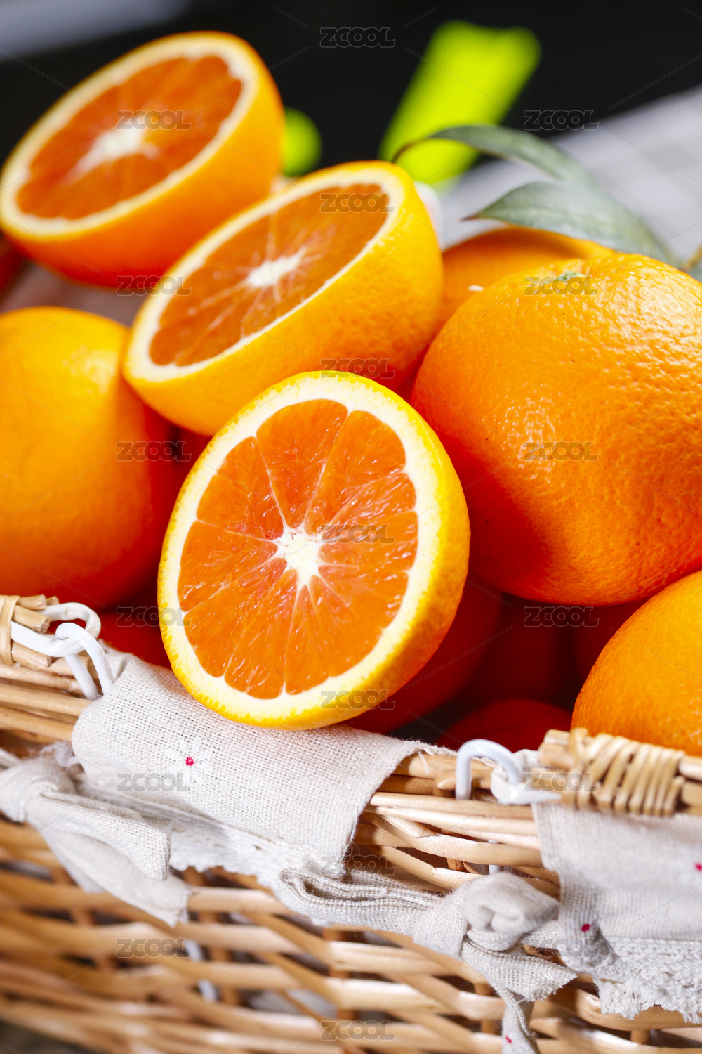 木桌上放在竹筐里的多个切开的雷波脐橙