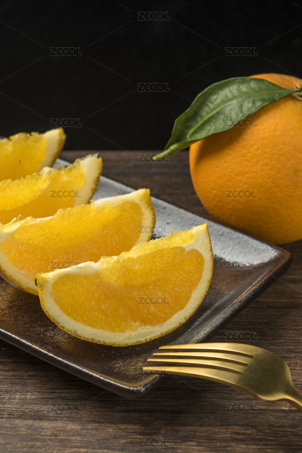 切开的橙子和一杯橙汁摆放在木桌面上深色调