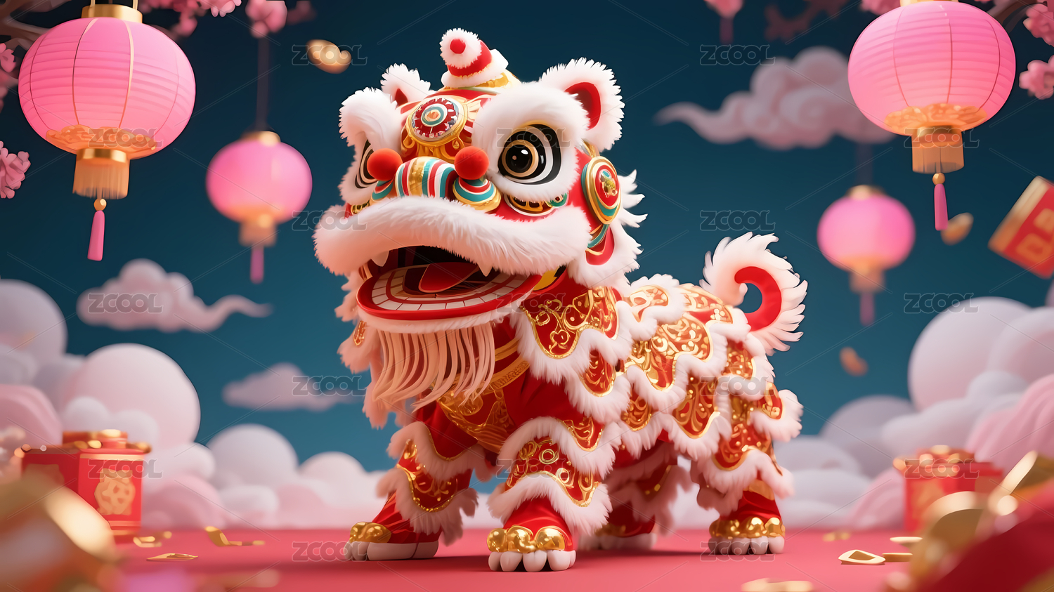 红色喜庆的3D卡通舞狮