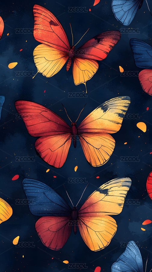 梦幻飞舞煽动翅膀的彩色蝴蝶印花图案