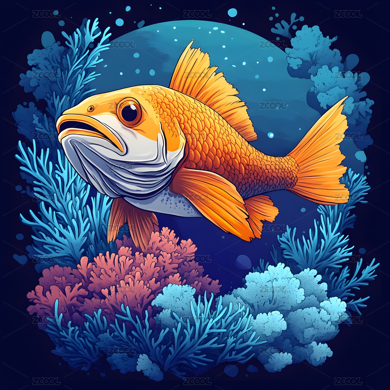 深海鱼类在珊瑚中游泳的卡通风格插画