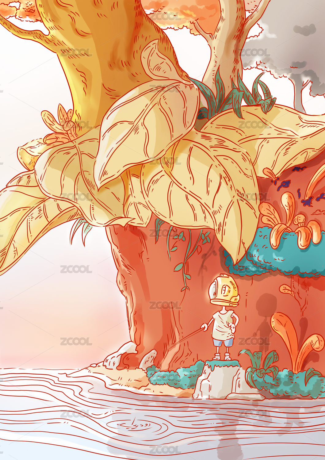 清新卡通钓鱼的少年