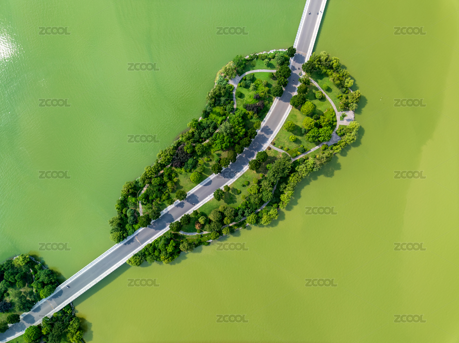夏季白天正上方视角航拍徐州云龙湖湖上公路