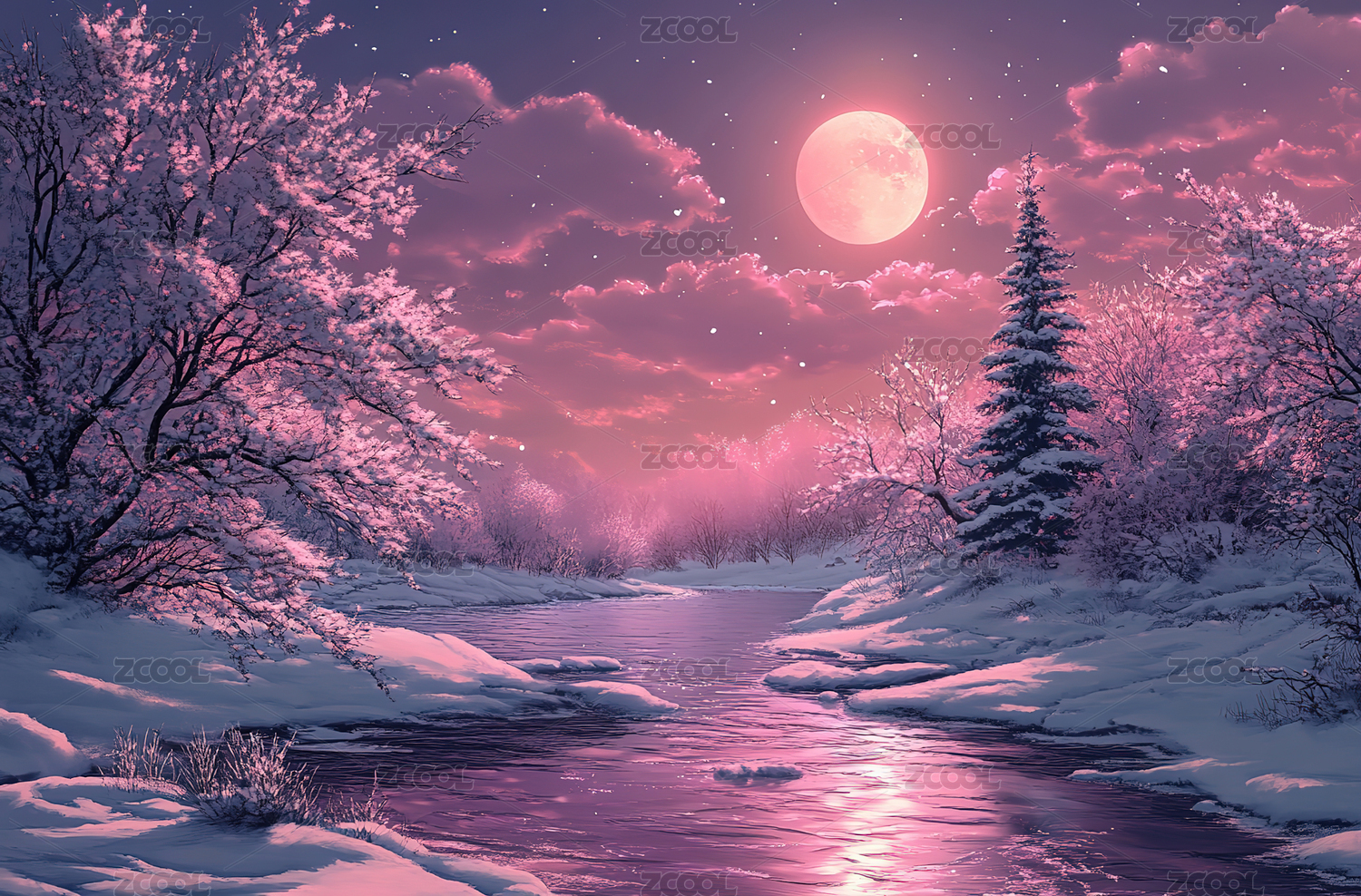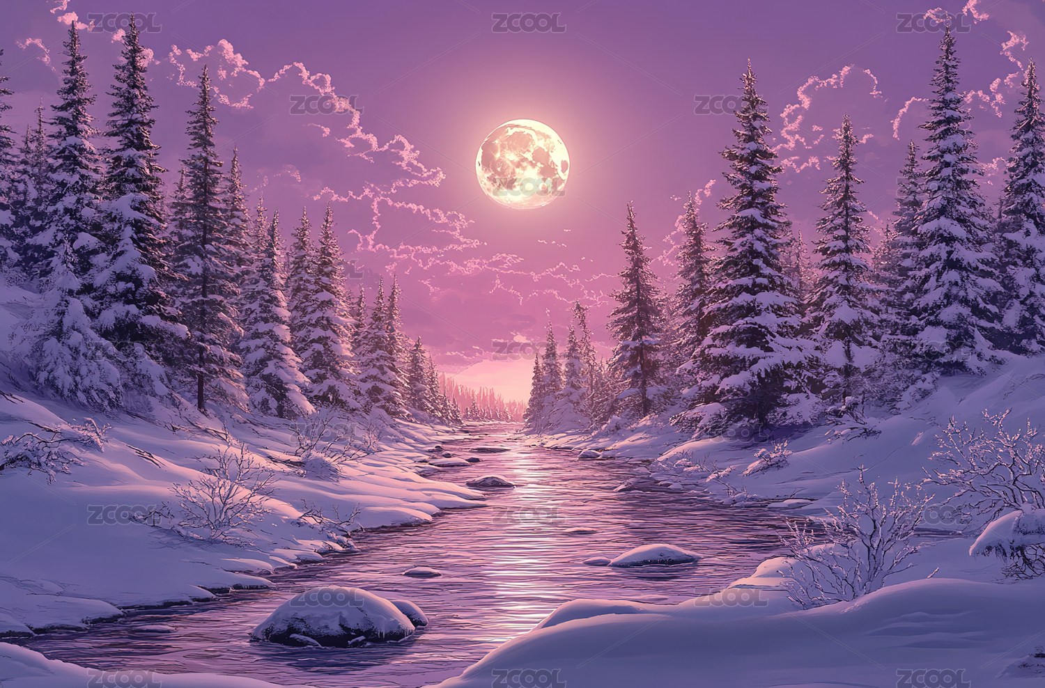 树木, 宁静, 自然,雪景, 冬天, 河流, 日落, 夕阳, 松树, 白雪