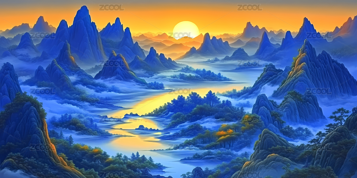 奇幻山川日落美景