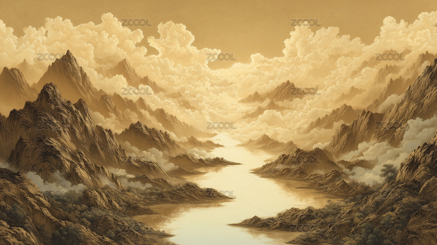 金色山水流河远雾