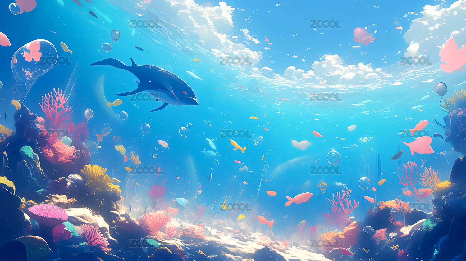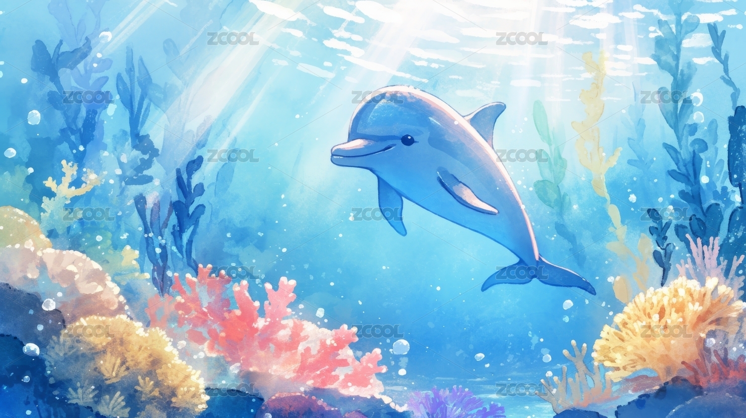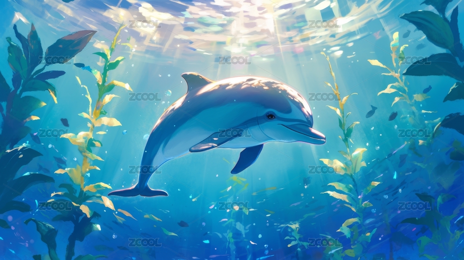 海豚可爱唯美野生动物3D卡通插画壁纸