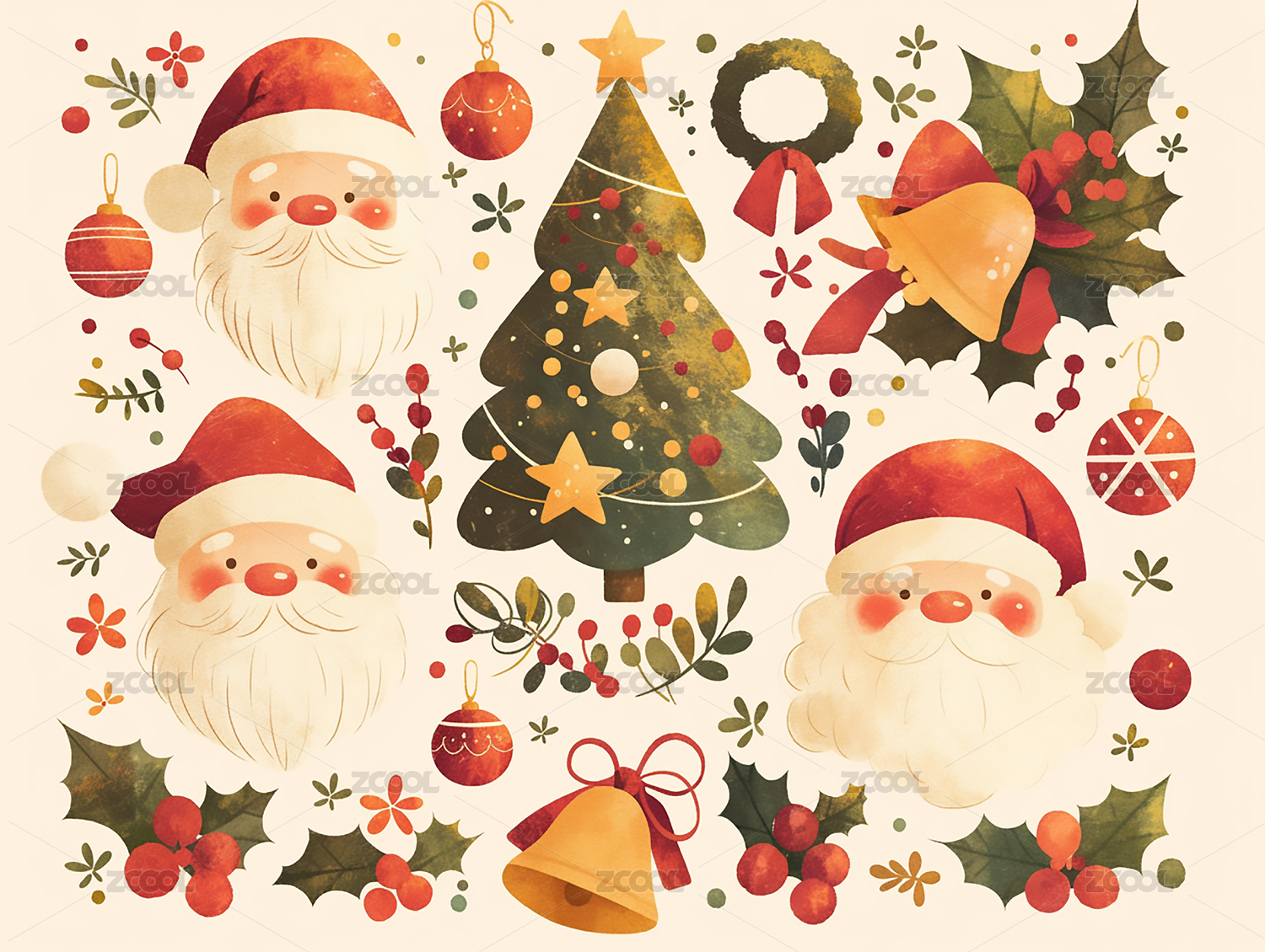 圣诞元素手绘水彩插画