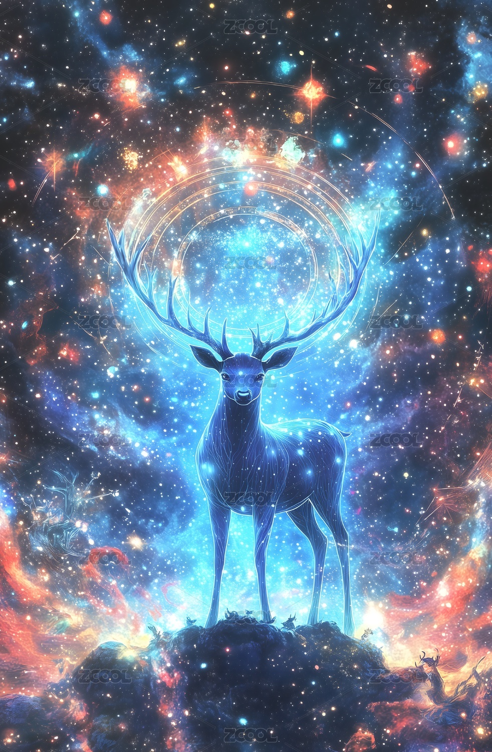 现代光效晕染,多彩星空背景的鹿