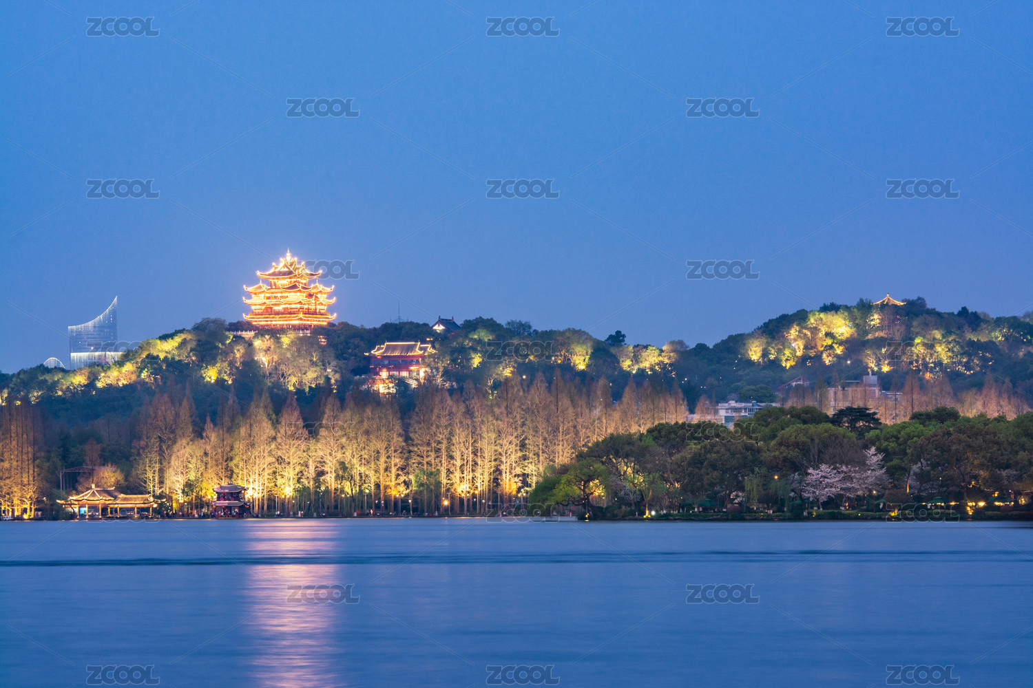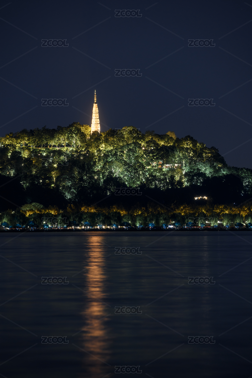 中国浙江杭州西湖春景雷峰塔与苏堤春晓夜景