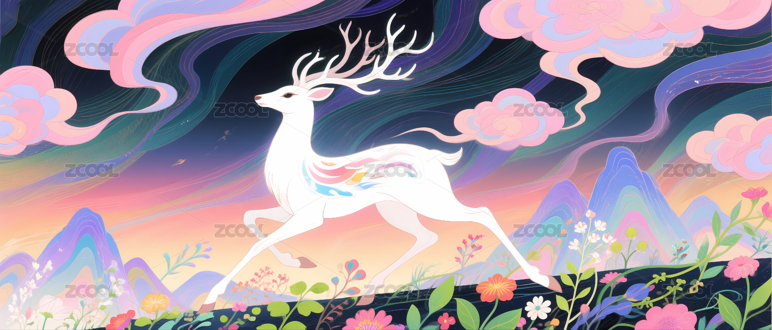 中国风,梅花鹿,动物,鹿,花,花儿,吉祥,祥瑞,祥云,插画