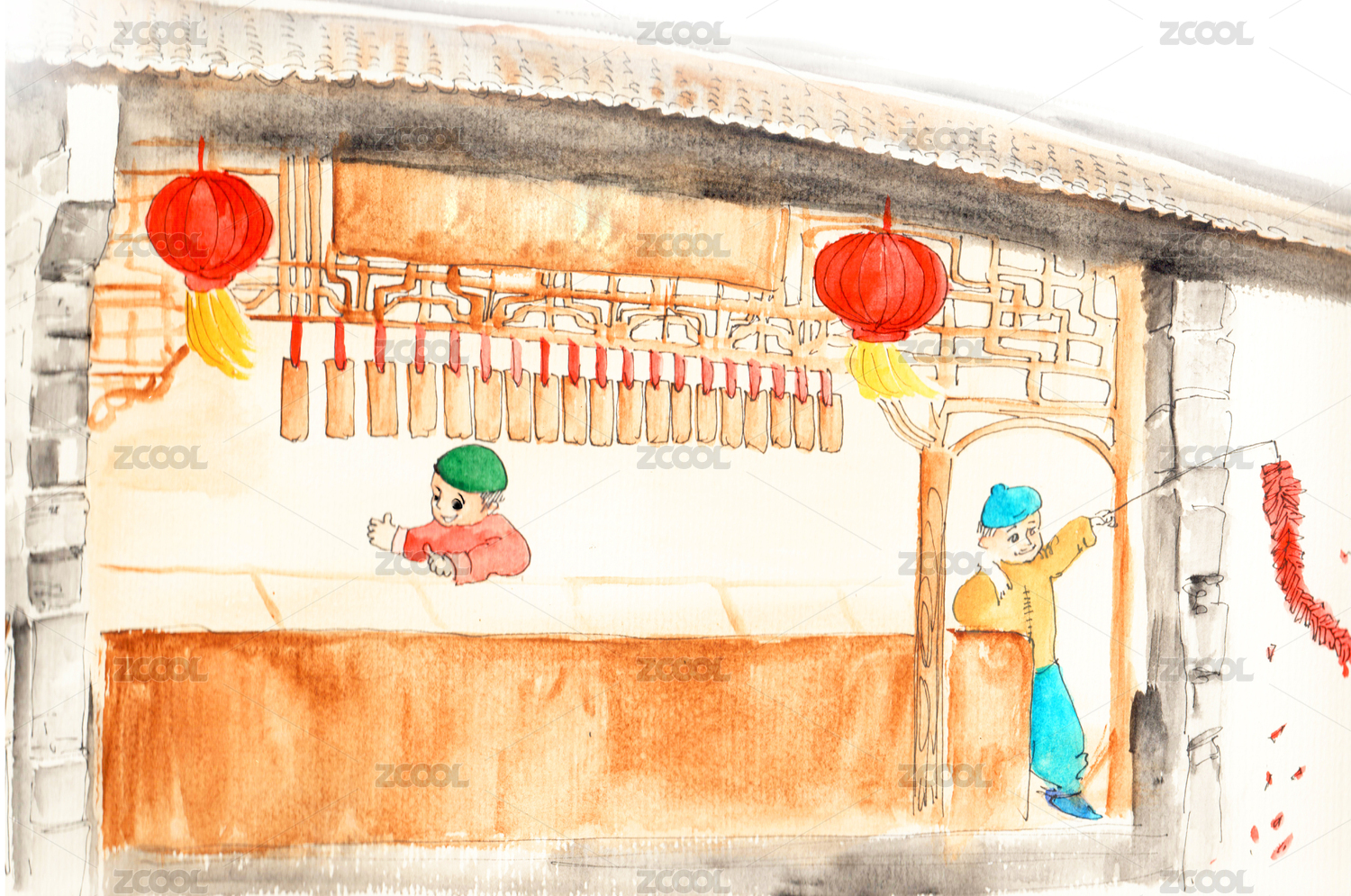 一个男人在挂灯笼,旁边的两个小孩正在放鞭炮的插画