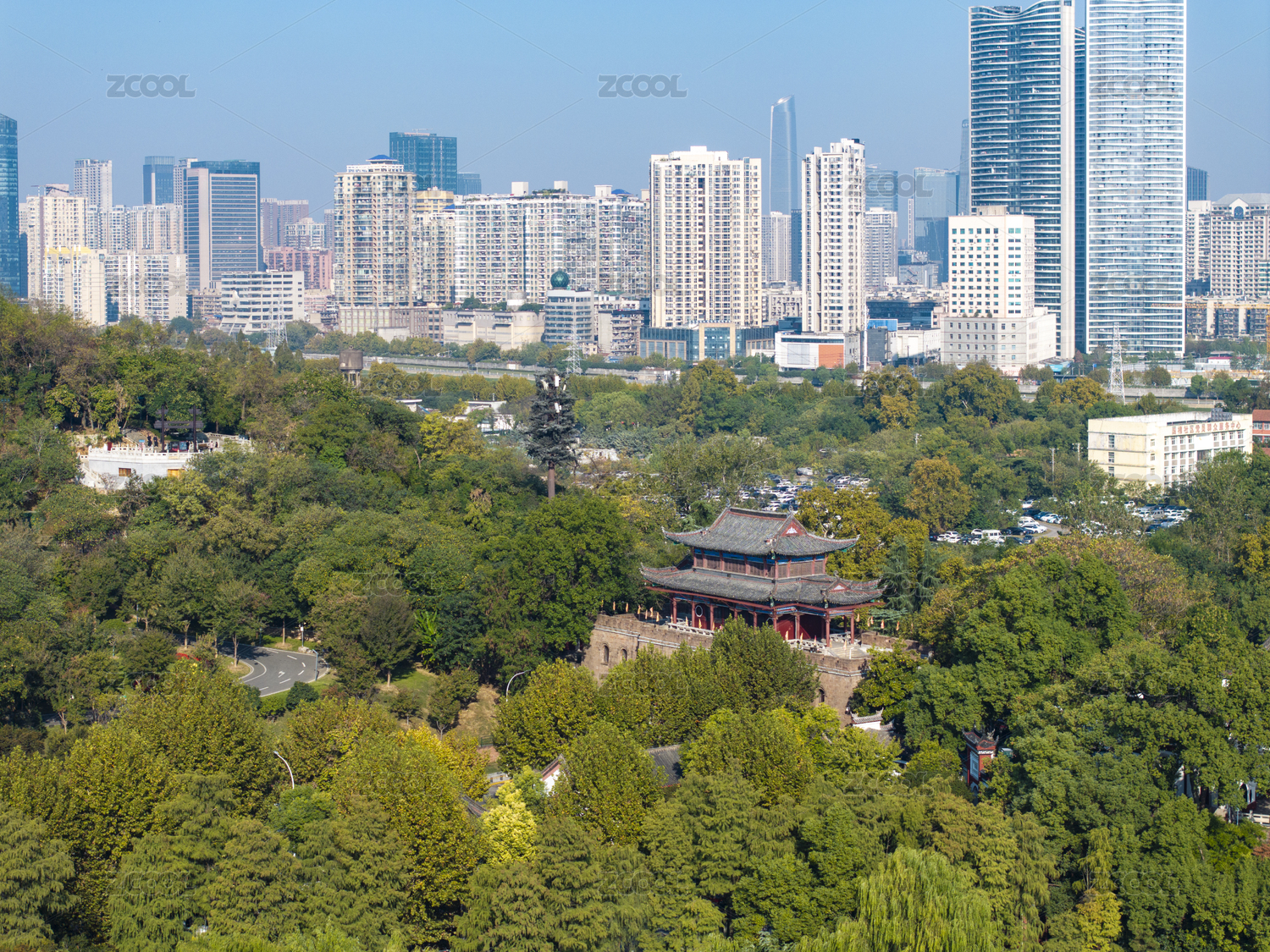 中国四川省成都市人民公园绿地和周边现代建筑航拍图