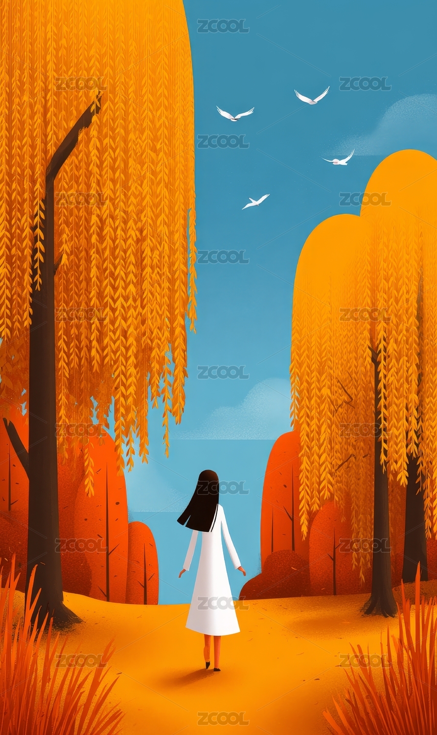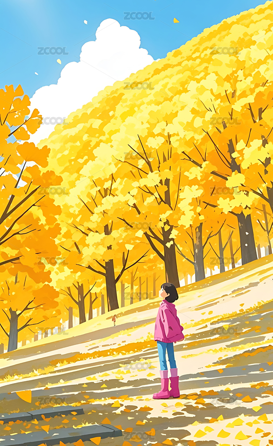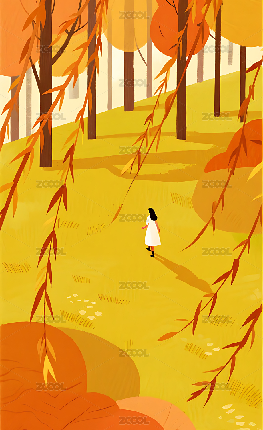 插画,女孩,落叶,秋季,黄色调,风景,人物
