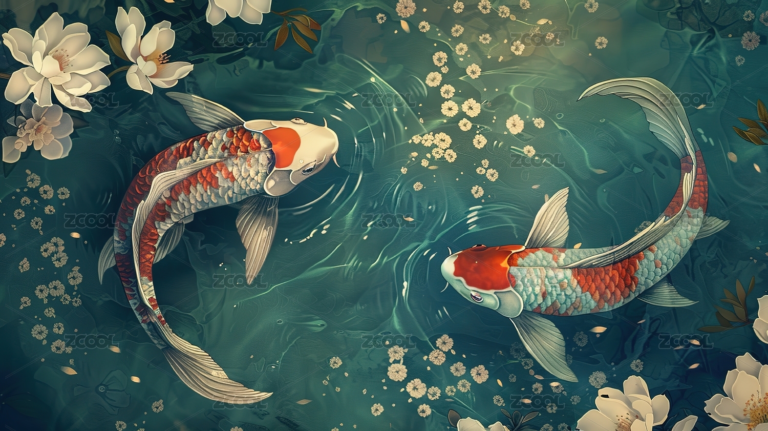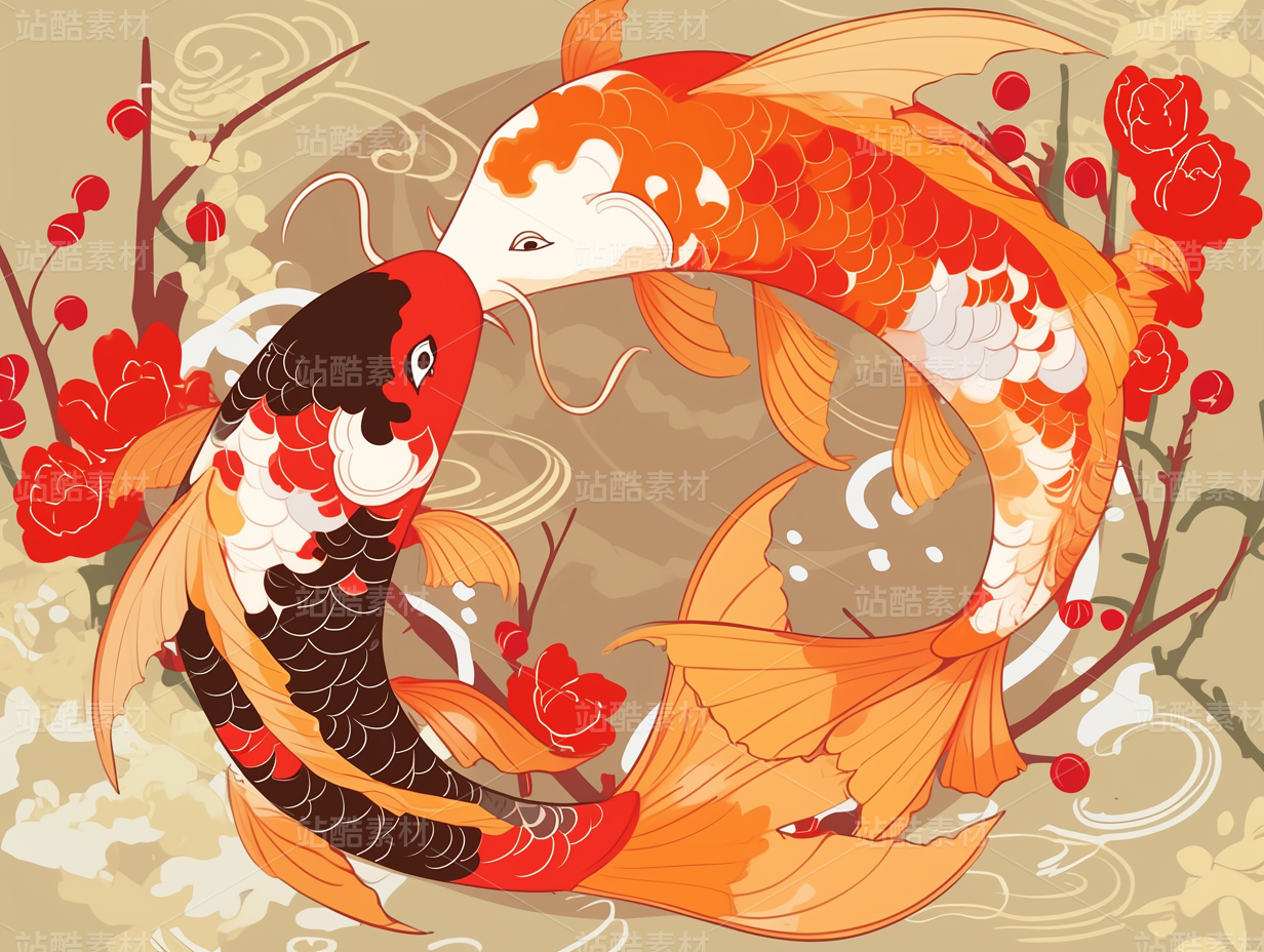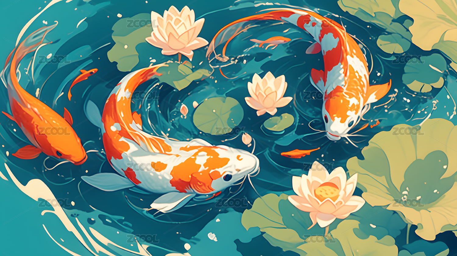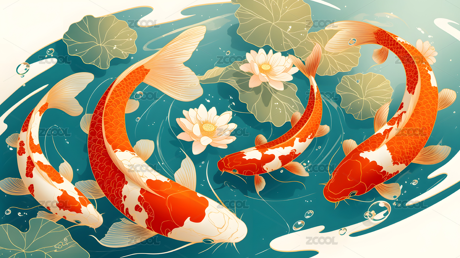 国潮,锦鲤,鱼类,浮世绘,绘画,荷塘,游泳