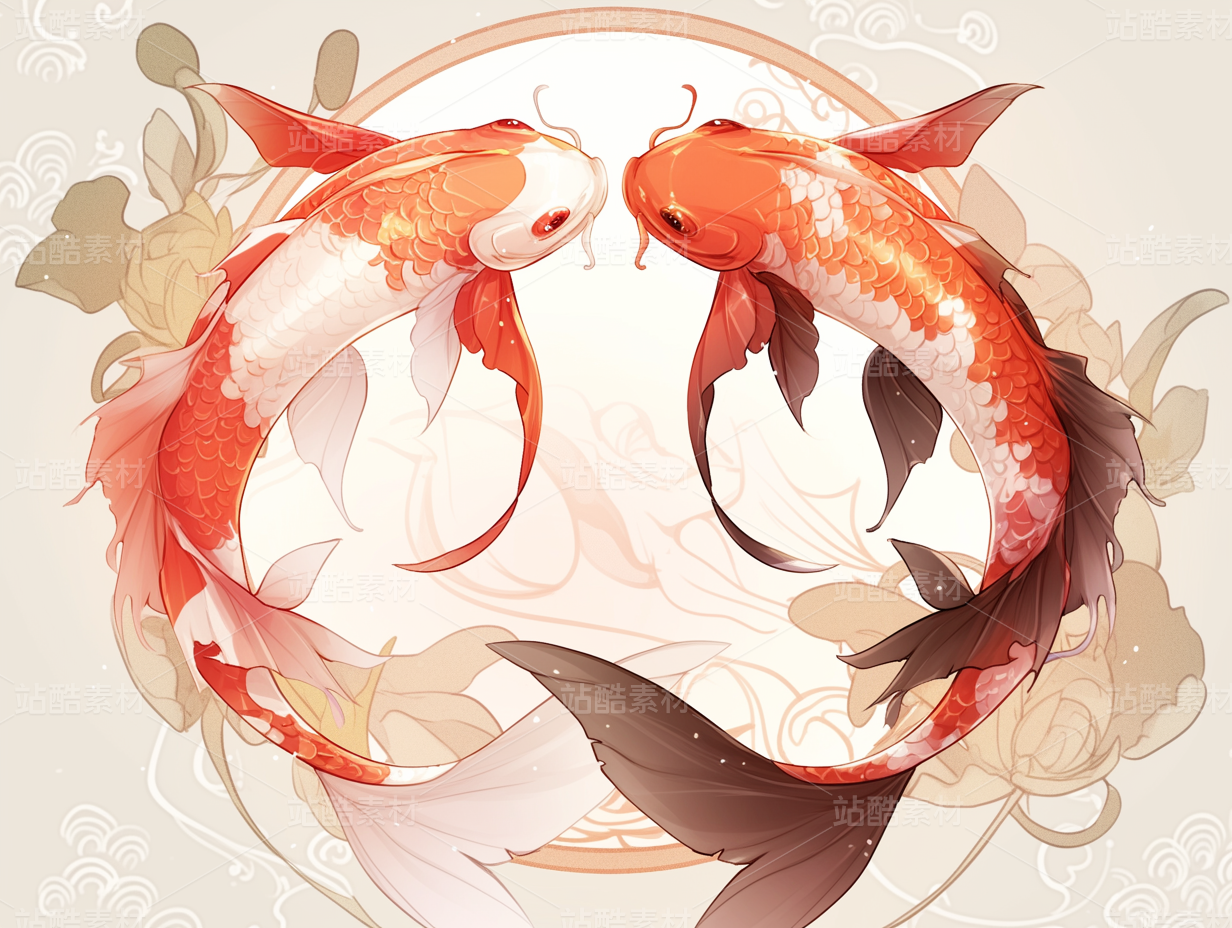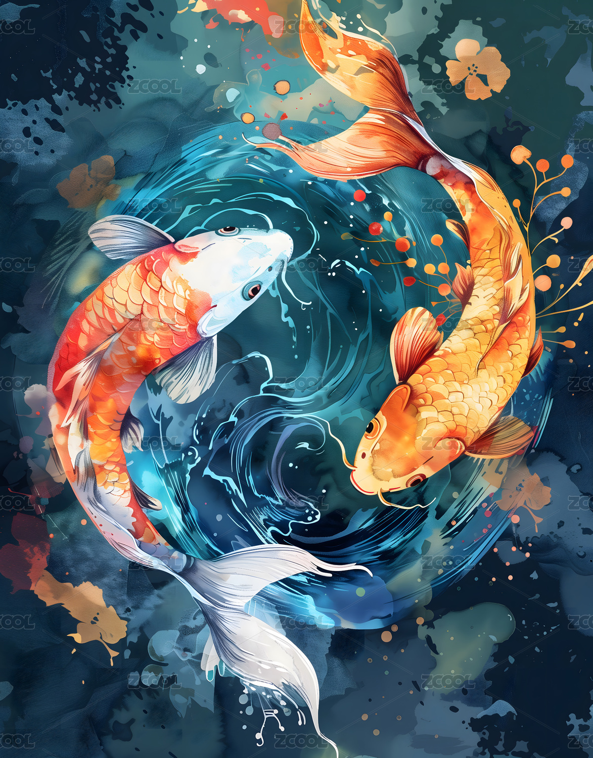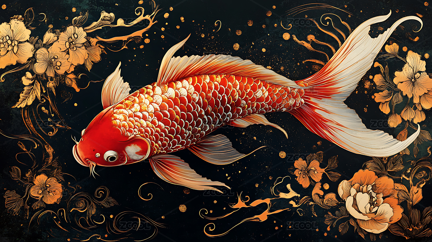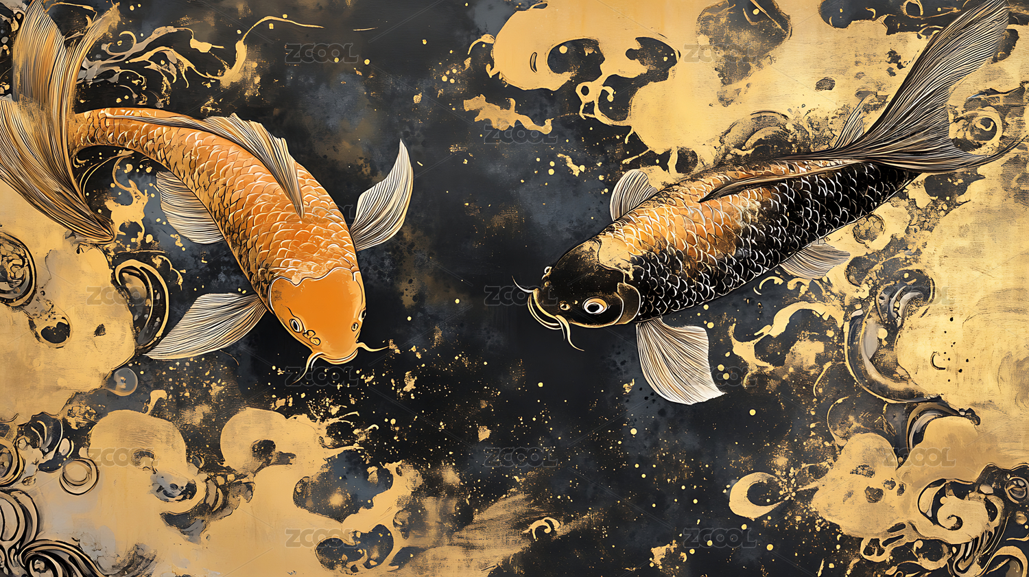 国潮,锦鲤,鱼类,浮世绘,绘画,荷塘,游泳
