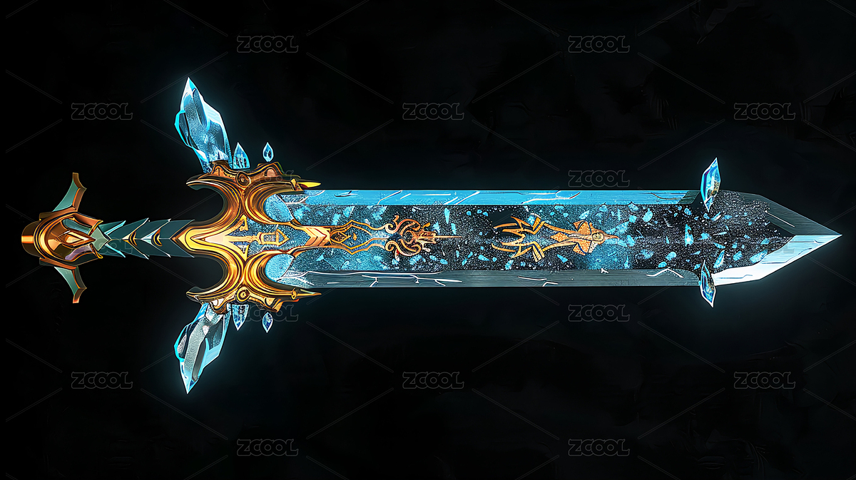 黑背景游戏装备武器荧光色宝剑3D立体插画