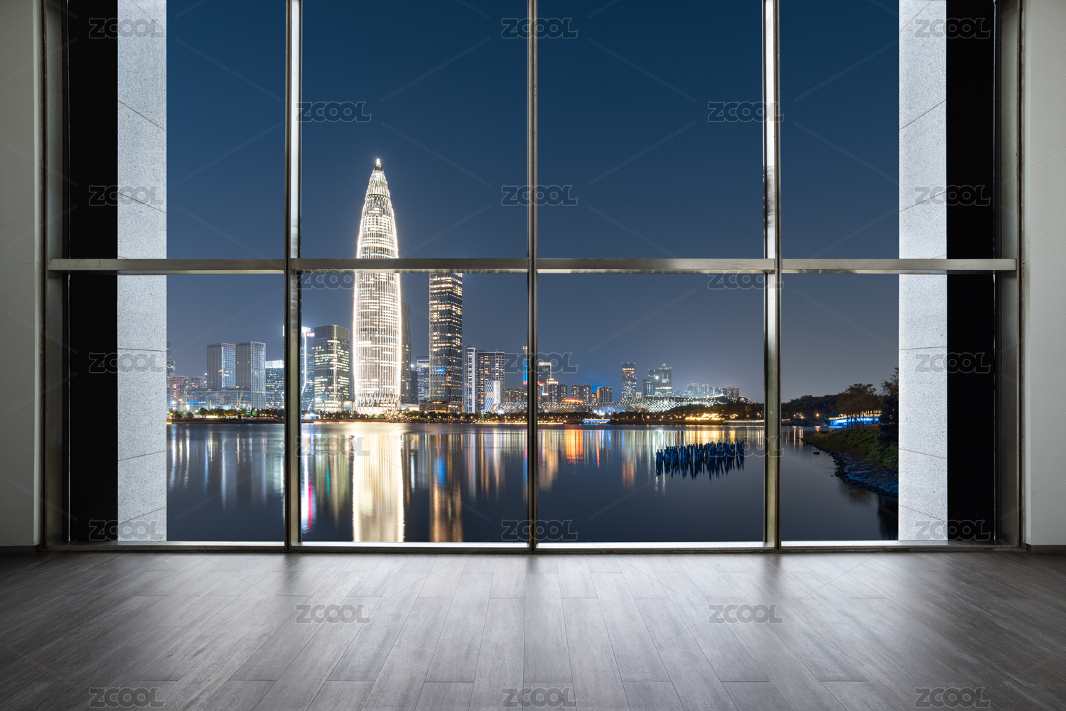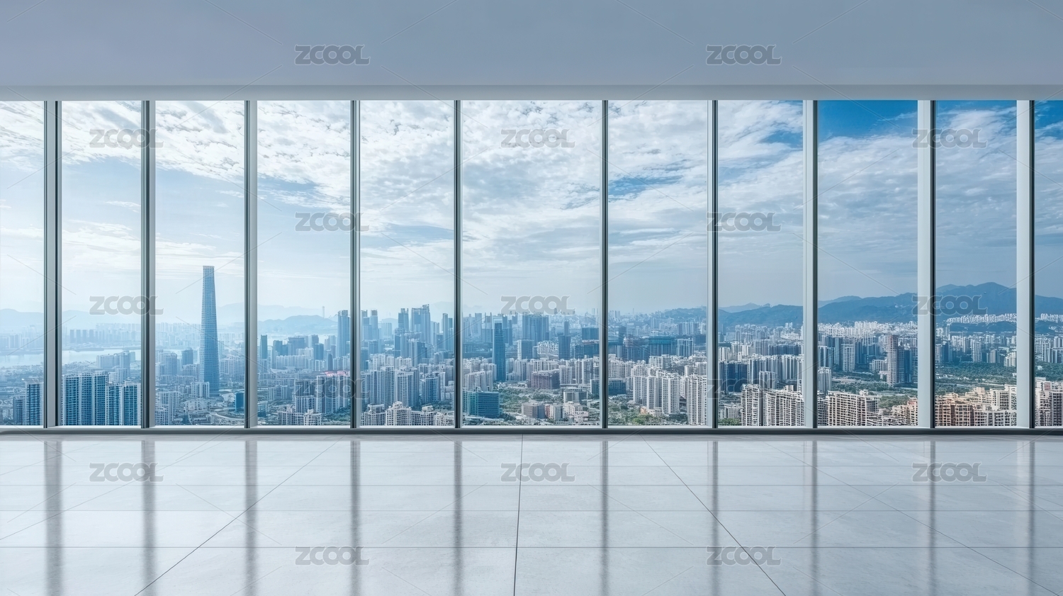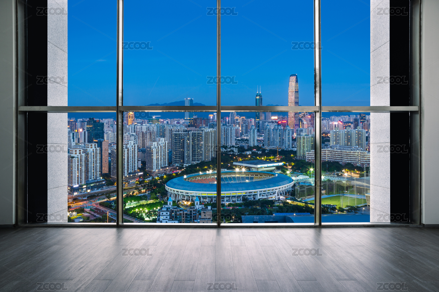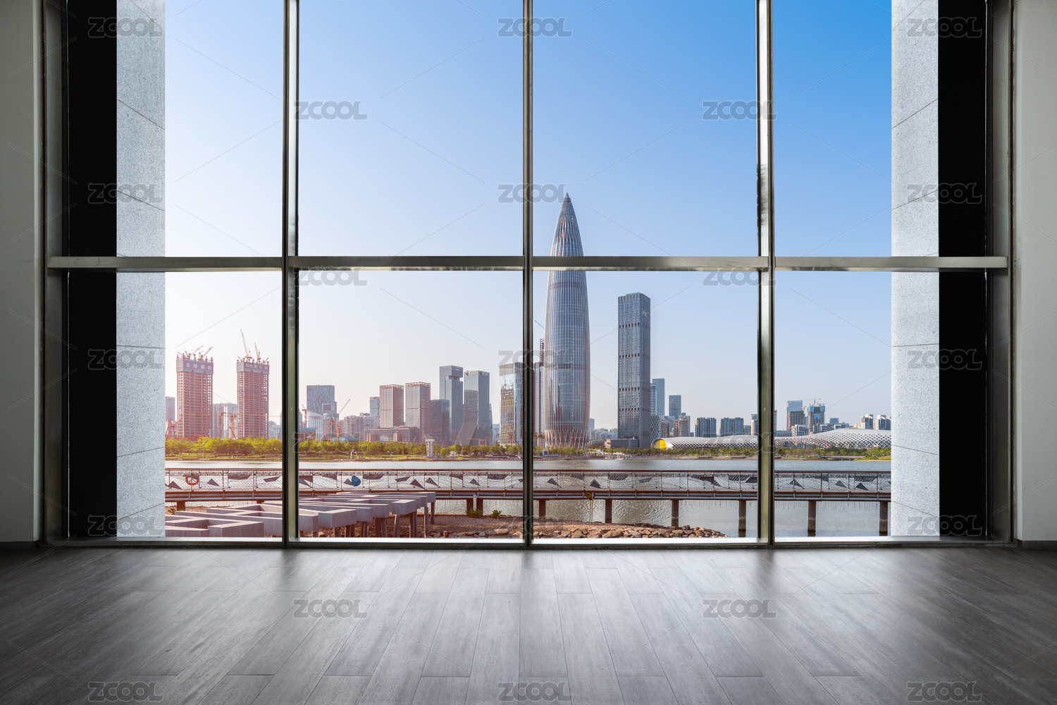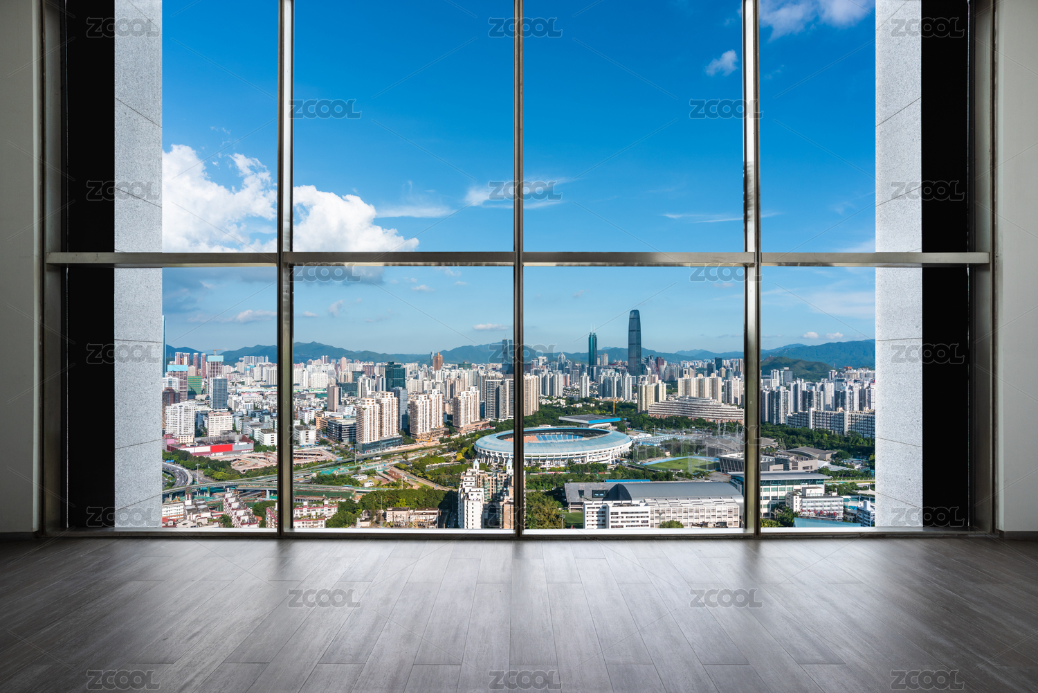 深圳高楼室内地板和窗外城市建筑