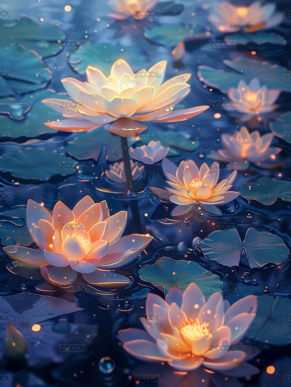 睡莲,橙黄色,深蓝色,水面,特写,光影,纹理,花瓣,对比,温暖色调