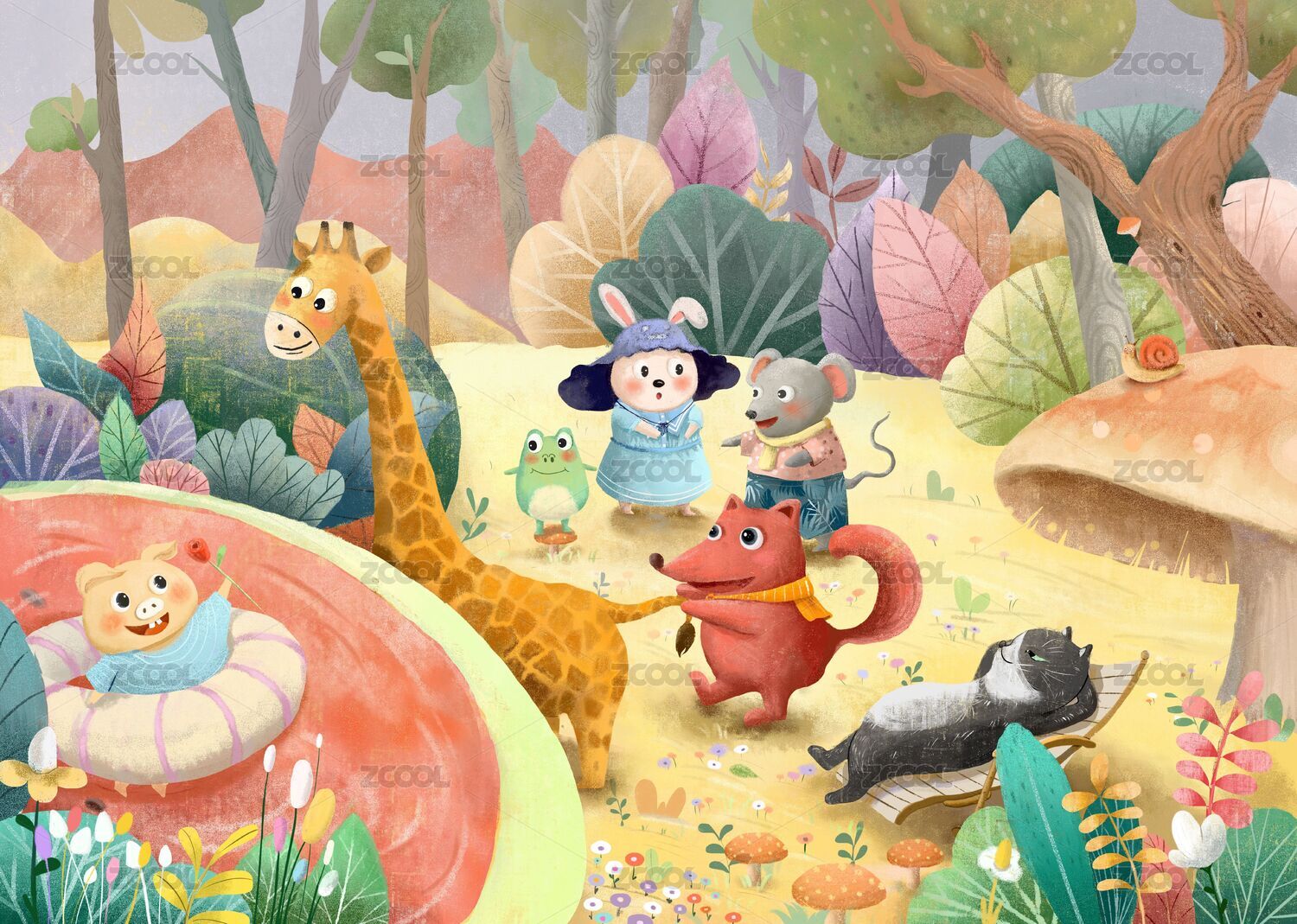 秋天小动物们在树下聚餐呼喊迟到的女孩
